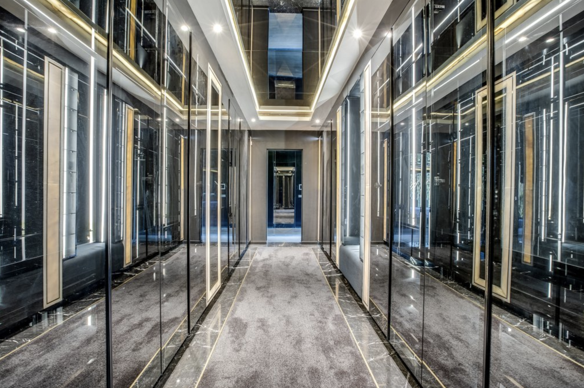 A closet with mirrored doors and ceiling with panels of LED strip lighting and the whole thing is very reflective and confusing.