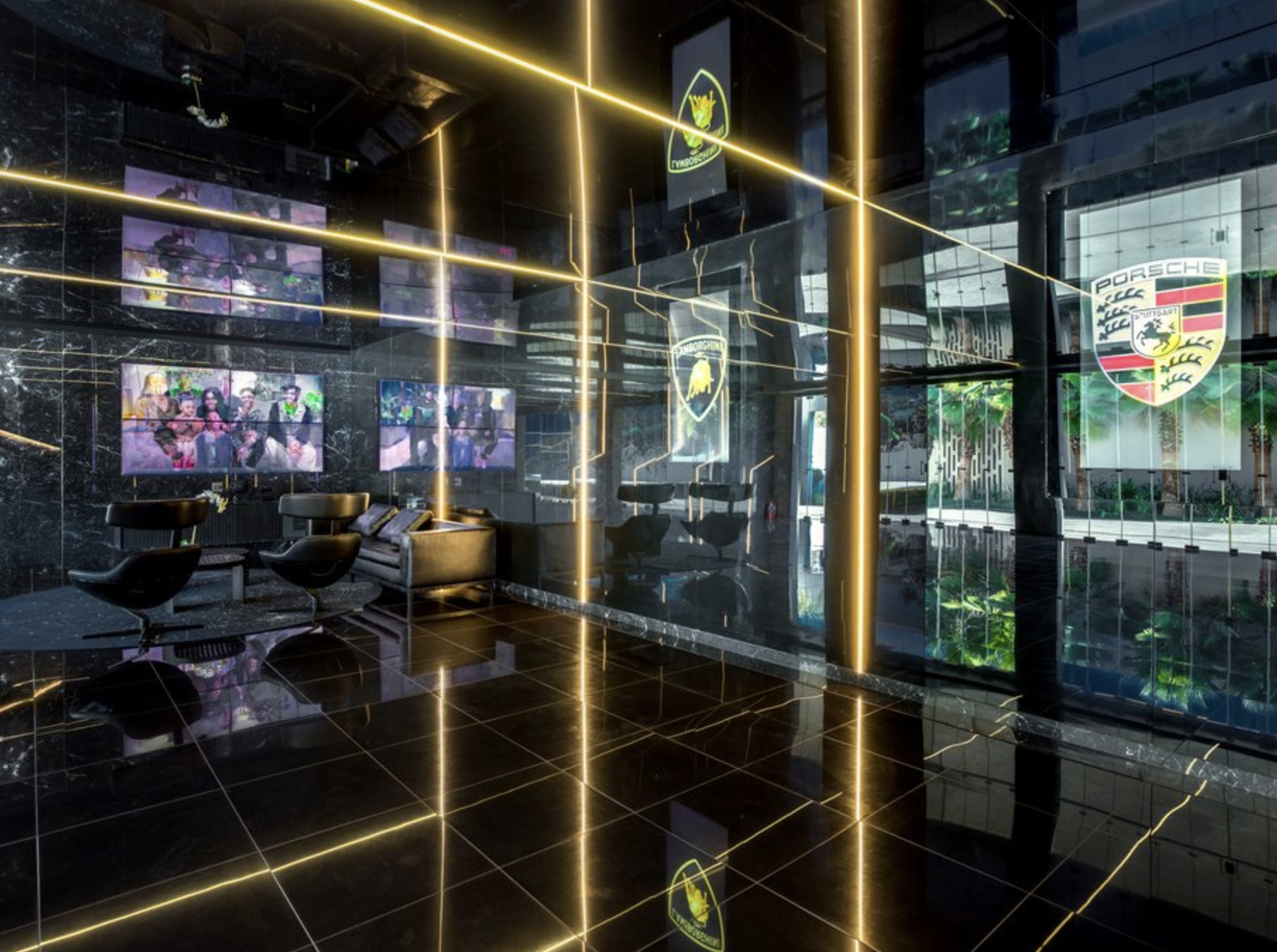 A room with a Porsche logo on the wall. The walls, floor and ceiling are black reflective and there is led strip lighting going down and across, so it's very hard to tell where the walls start and end.