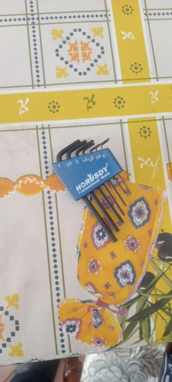 Un astuccio blu con chiavi a brugola da 3, 2.5, 2, 1.5, 1.24, 0.9, 0.7 mm.