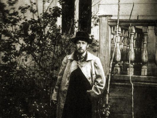 Anton Chekhov in 1893. Chekhov stands outdoors in front of a wooden structure with ornate balusters. He is dressed in a long, light-colored overcoat and a dark hat, with a full beard and a calm, direct expression. Surrounding him are bare branches and foliage, giving the scene a slightly austere atmosphere. https://en.wikipedia.org/wiki/Anton_Chekhov#/media/File:Chekhov_ht.jpg