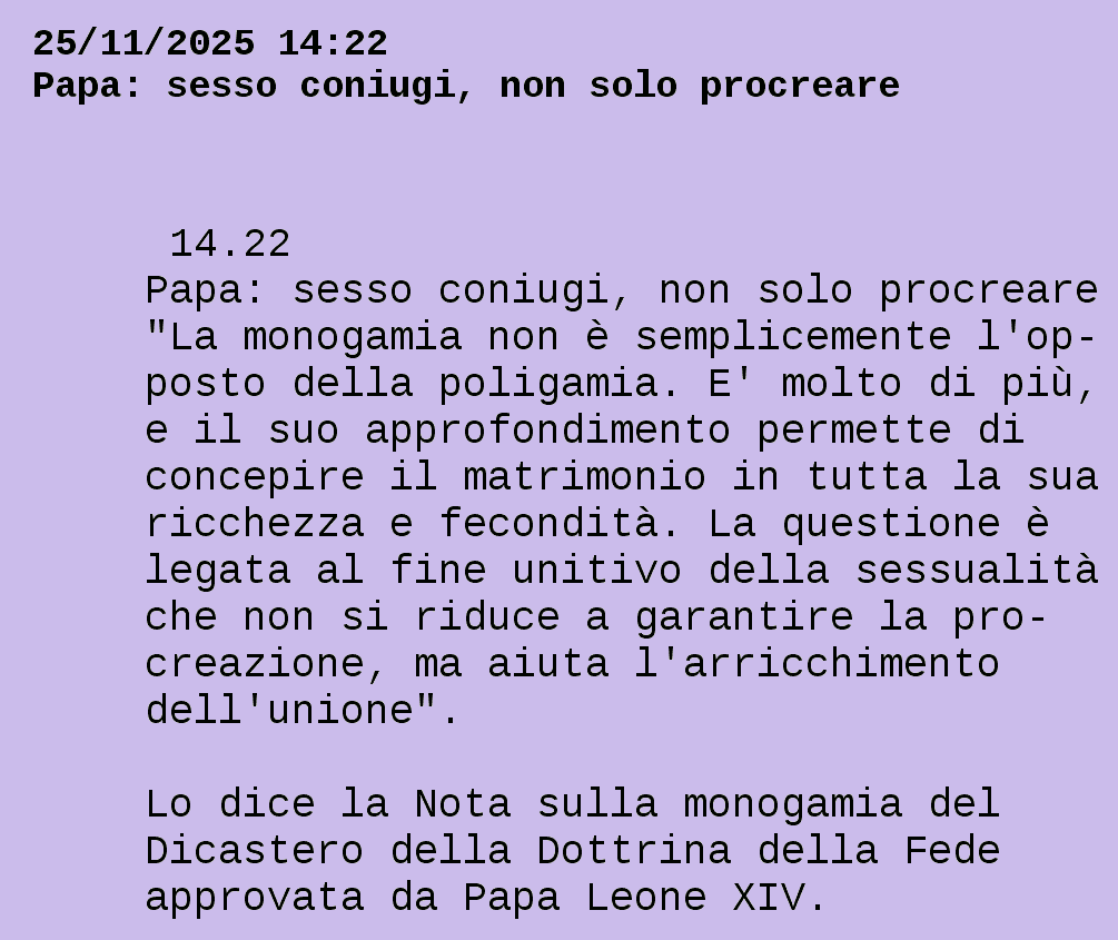 Da televideo rai: 25/11/2025 14:22 Papa: sesso coniugi, non solo procreare 14.22 Papa: sesso coniugi, non solo procreare "La monogamia non è semplicemente l'op- posto della poligamia. E' molto di più, e il suo approfondimento permette di concepire il matrimonio in tutta la sua ricchezza e fecondità. La questione è legata al fine unitivo della sessualità che non si riduce a garantire la pro- creazione, ma aiuta l'arricchimento dell'unione". Lo dice la Nota sulla monogamia del Dicastero della Dottrina della Fede approvata da Papa Leone XIV.