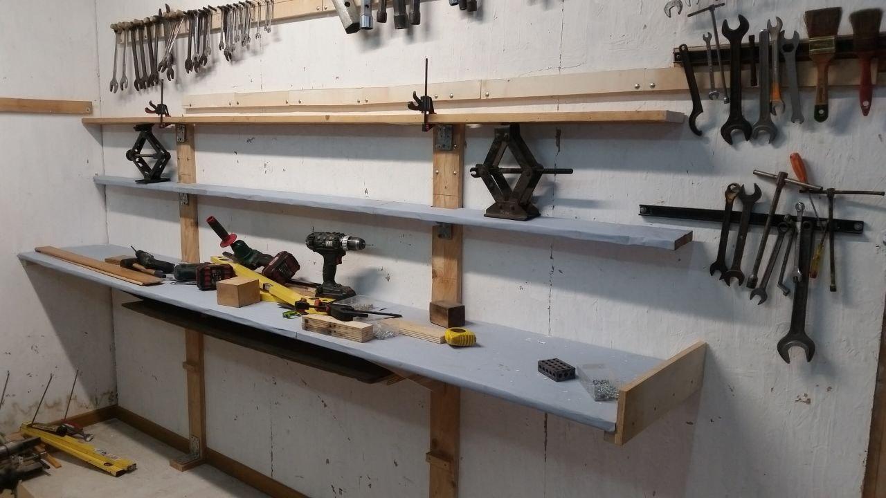 Scaffale con un ripiano grande, rivestito con vecchi manifesti capovolti, e due piccoli sopra, uno rivestito e uno grezzo. Quello piΓΉ in alto Γ¨ sorretto con due cric a parallelogramma.