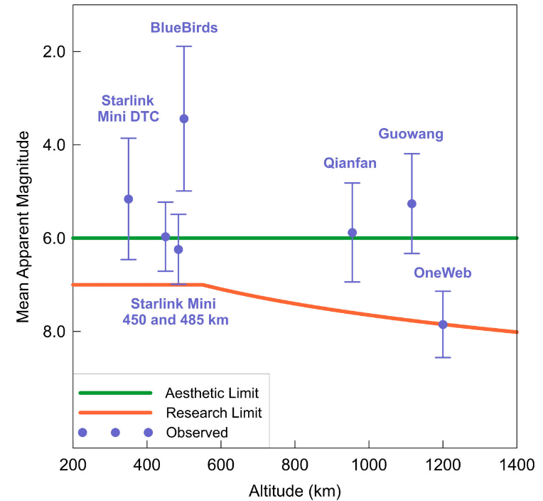 A plot showing orbital altitude vs. apparent magnitude (brightness) for a bunch of different megaconstellations. The AST SpaceMobile Blue Bird satellites are the worst, but Starlink direct-to-cell are nearly as bad due to their large sizes and low altitudes. OneWeb is the only megaconstellation that is halfway below the recommended brightness limit.