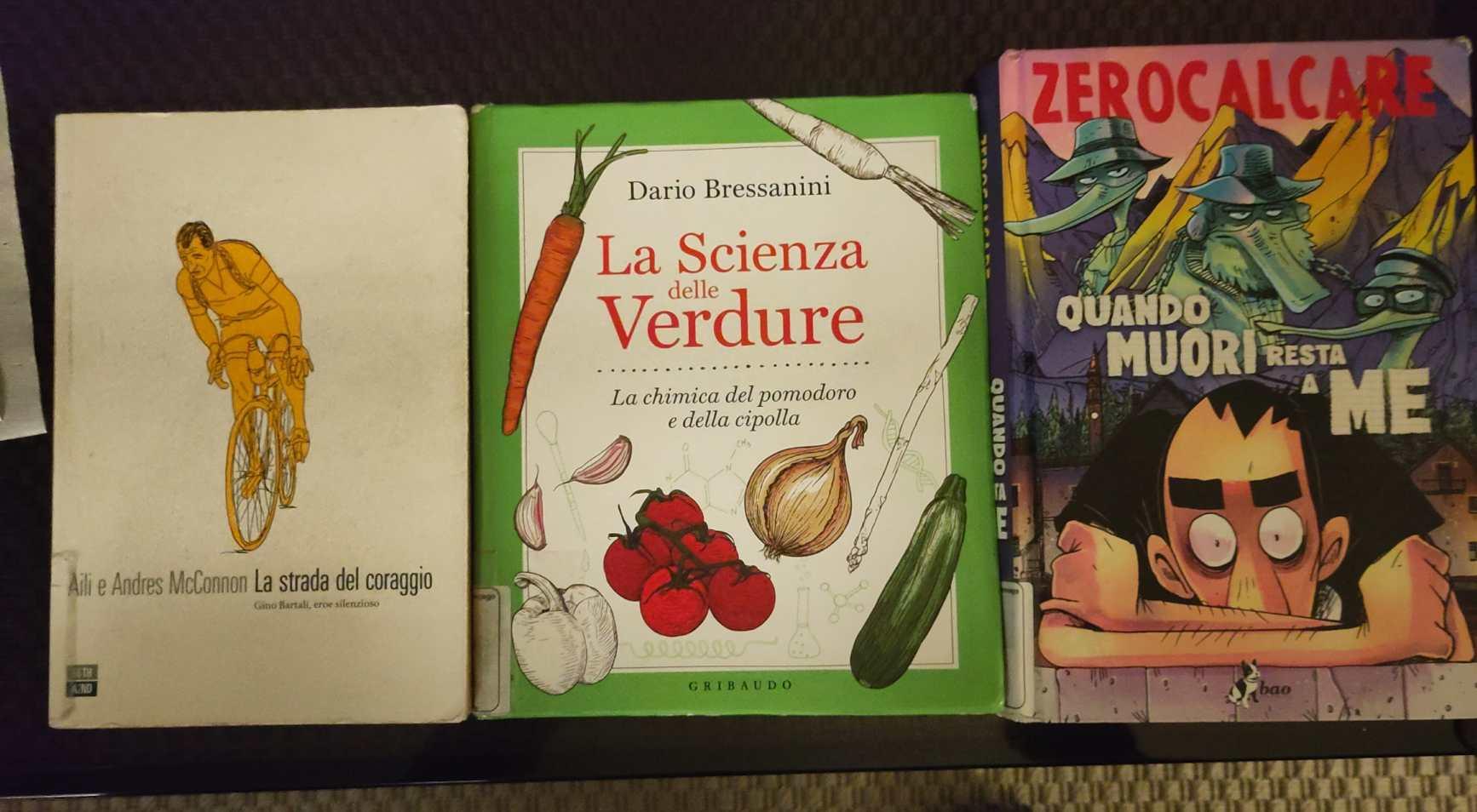 Foto di 3 libri che ho preso in biblioteca oggi: - la strada del coraggio, libro su Bartali - la scienza delle verdure di Dario Bressanini - Quando muori resta a me di Zerocalcare