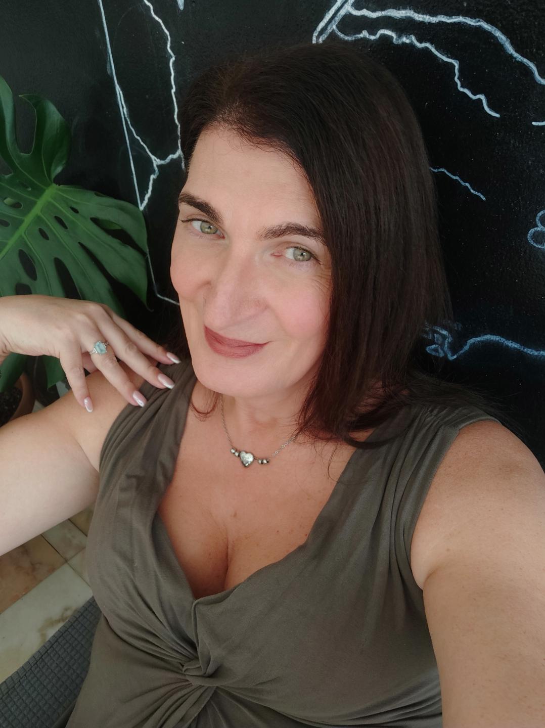 A selfie of a brunette woman smiling in a brown dress and silver jewellery