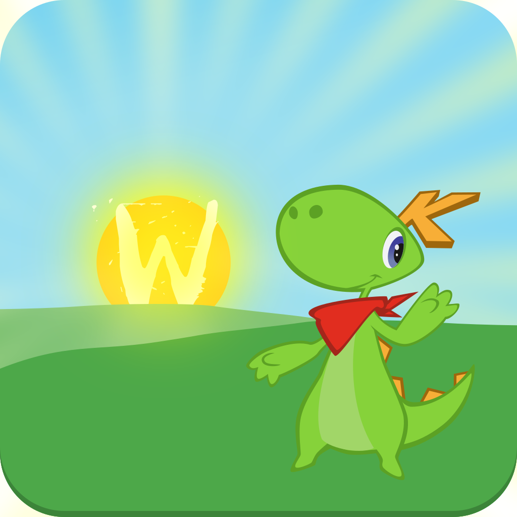 The Wayland (a yellow circle with a W in the center) rises over green pastures where Konqi frolics happily.