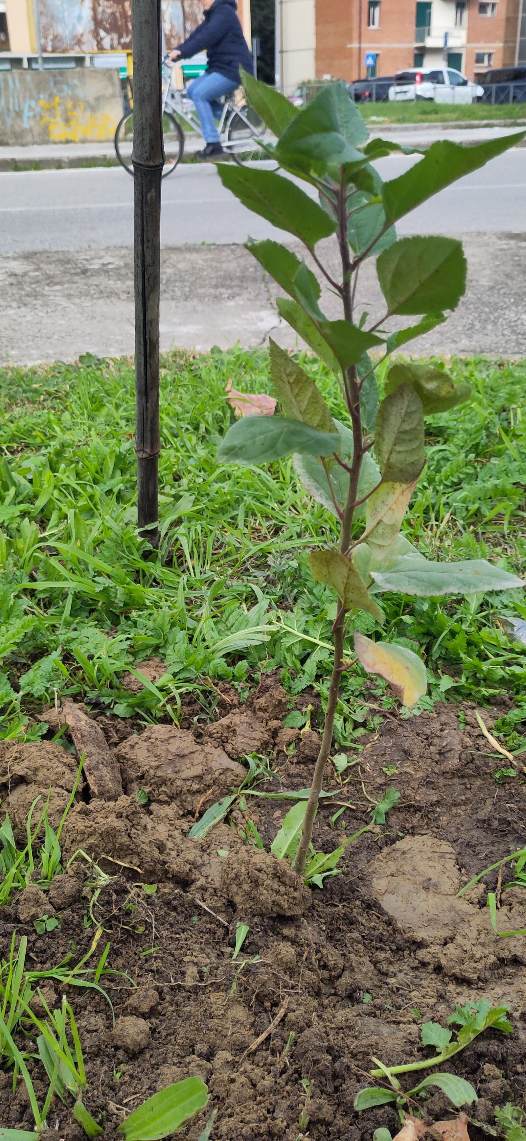 Un giovane melo. Sullo sfondo, un paesaggio urbano con una persona che passa in bicicletta.