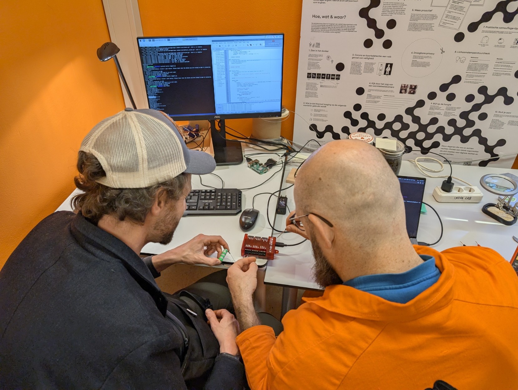 The back of two people connecting wires together