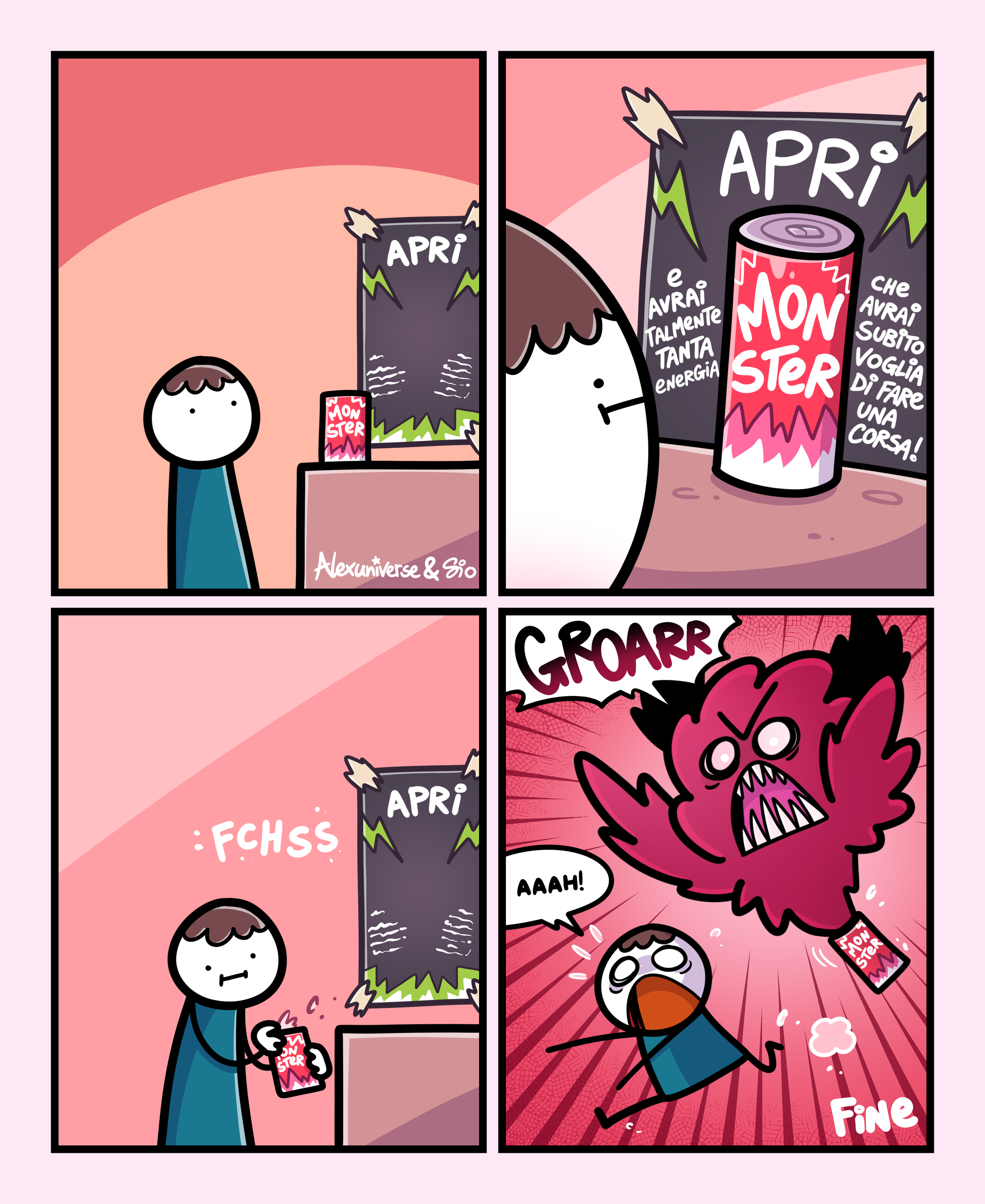 1 Vediamo un tizio davanti a un banchetto delle bibite Monster. C'รจ una lattina su un tavolino con dietro un cartello con scritto Apri. 2 Il tizio si avvicina. Leggiamo meglio la scritta sul cartello: Apri. E avrai talmente tanta energia che avrai subito voglia di fare una corsa! 3 Il tizio apre la lattina che emette il classico suono FCHSS di una bibita gasata. 4 Dalla lattina di Monster esce un mostrone rosso che urla: "Groarr!" Il tizio inizia a correre urlando. FINE
