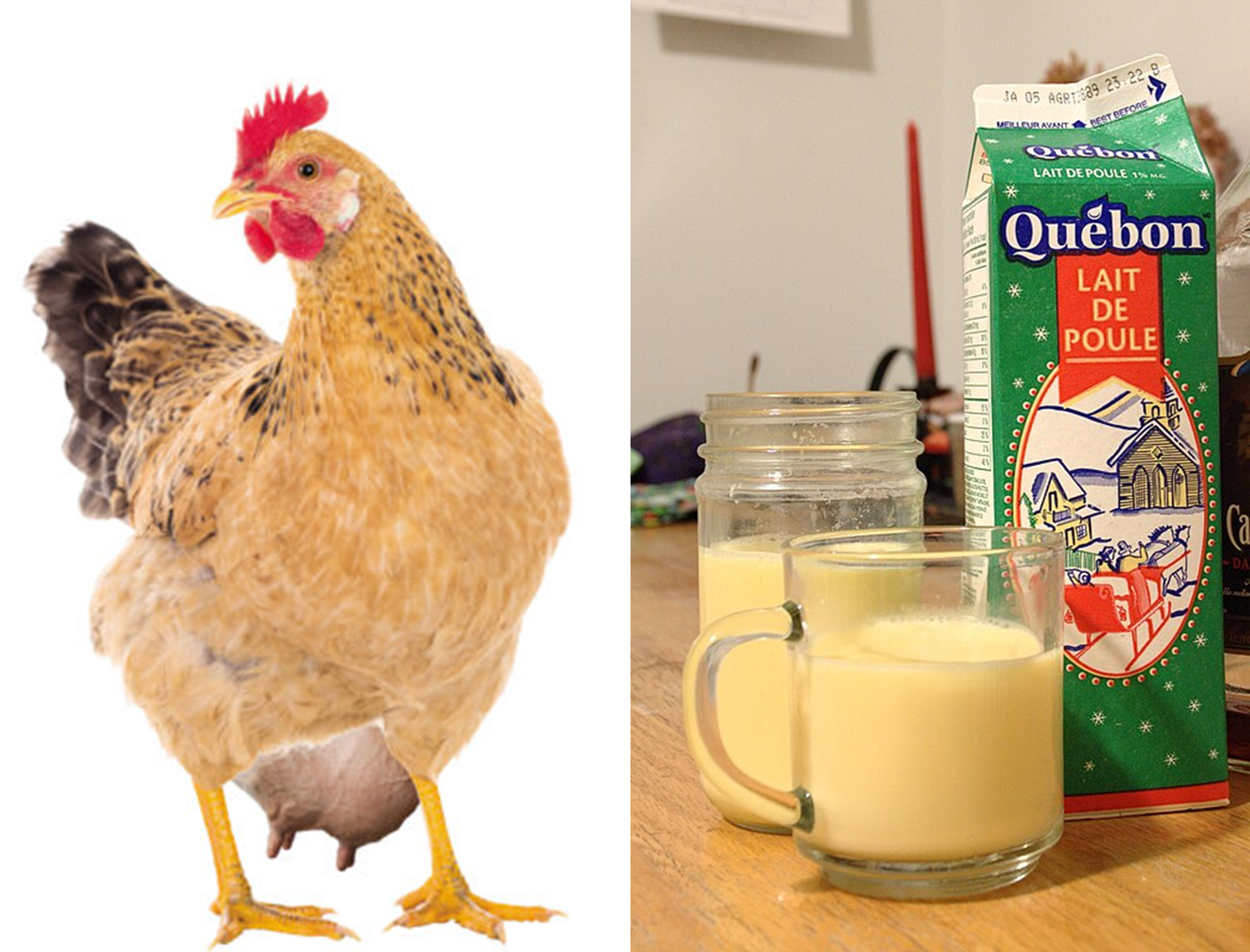 1. Facetious image of a chicken with udders 2. A carton and a glass of eggnog from Montréal, Québec, showing its French façade and the French term lait de poule (literally, "hen's milk")