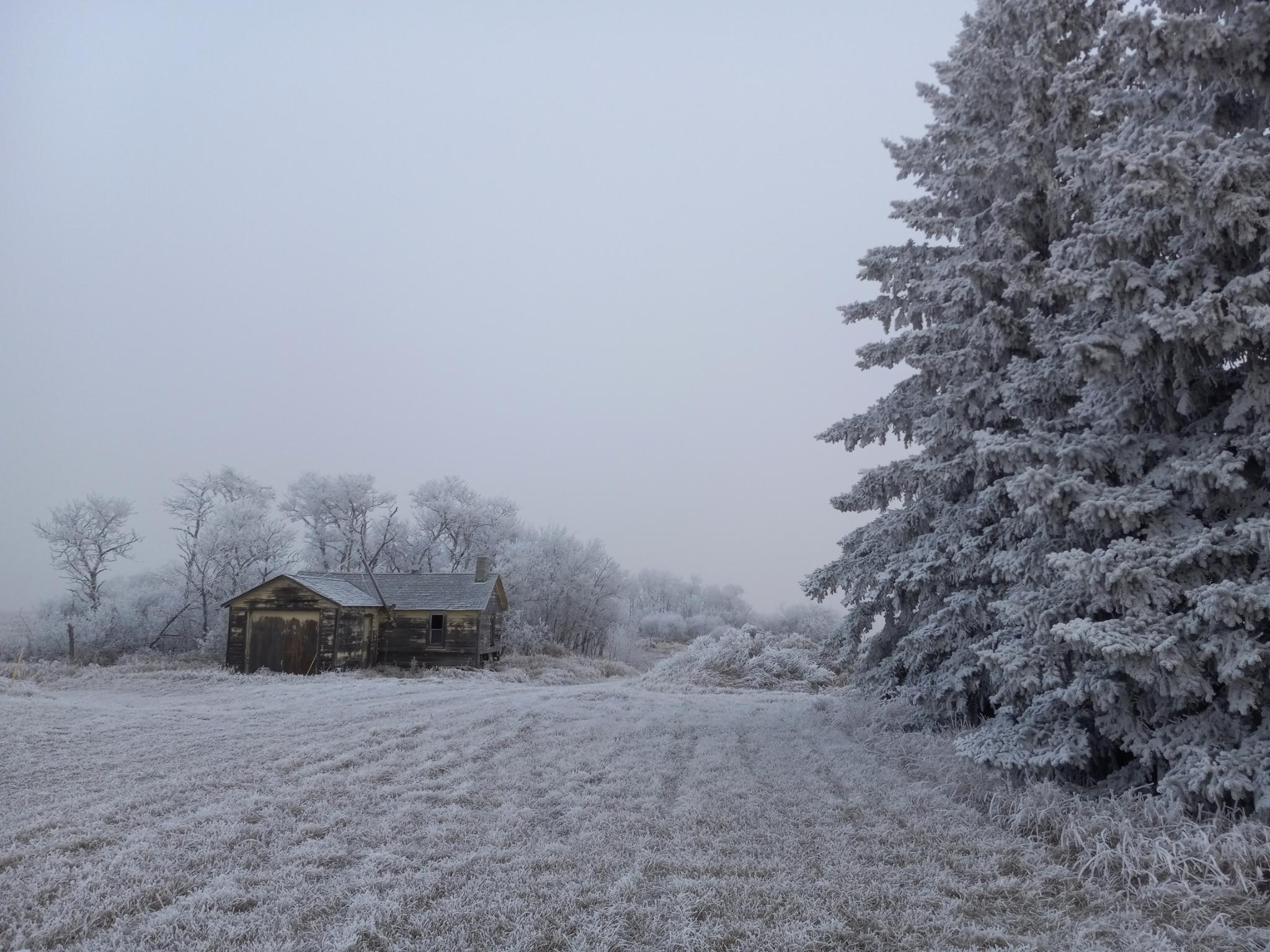 Looking across frosted grass, with tall completely-frosted spruce trees on one side of the photo, and frosted woods with a frosted abandoned building on the other side. The sky above is grey and foggy. The only colour is a little bit of pale yellow paint that hasn't totally peeled off the abandoned building.