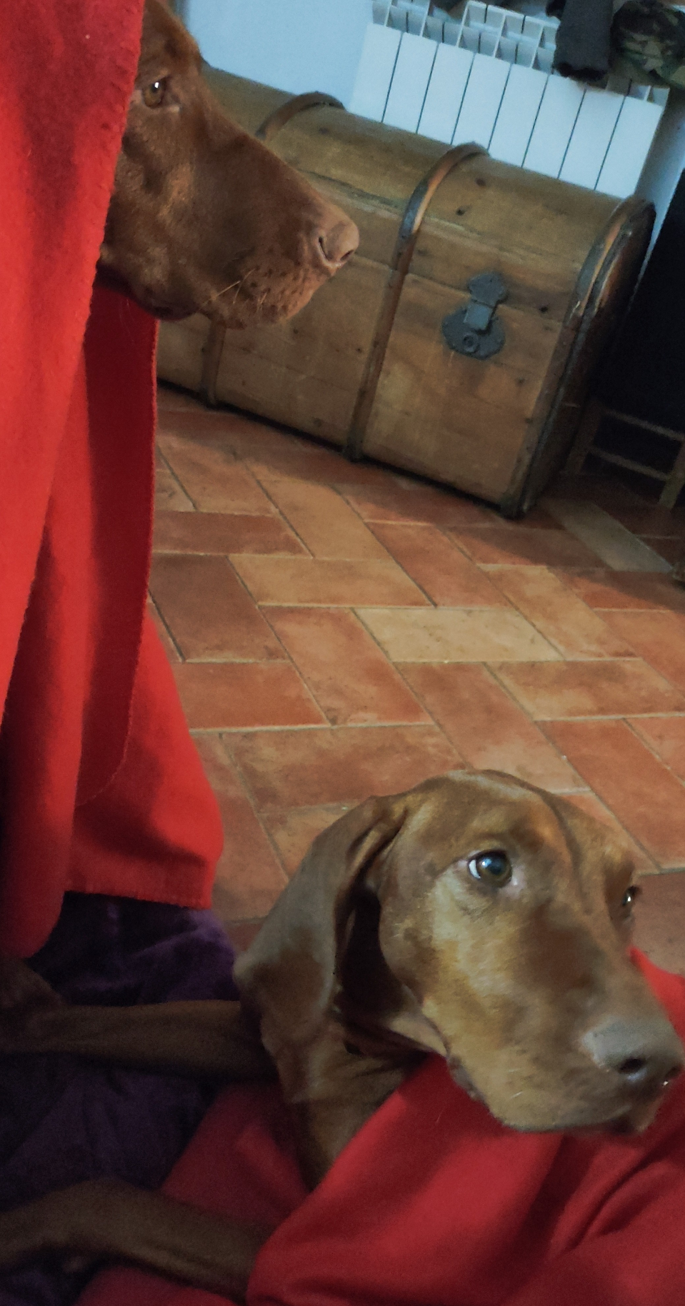 Ecco seduta con una coperta rossa a mo' di velo, esce il miso, Mia accovacciata nella coperta, ha la testa fuori, sta guardando verso il camino, dietro un baule di legno