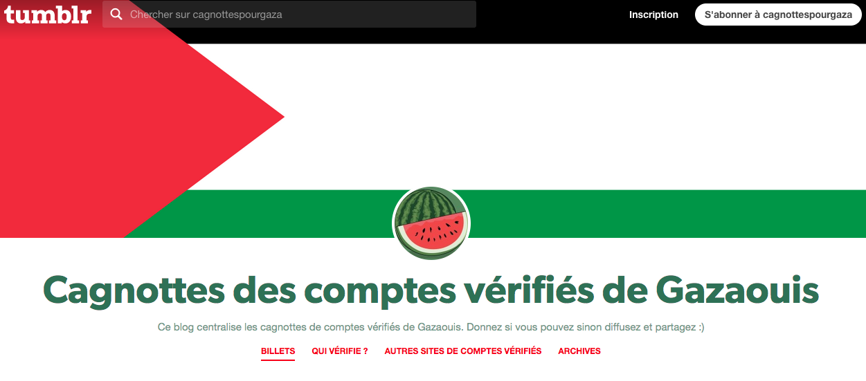 aperçu de la page du Tumblr https://cagnottespourgaza.tumblr.com/ drapeau palestinien en bannière pastèque en photo de profile titre du blog : Cagnotte des comptes vérifiés de Gazaouis texte sous le titre : Ce blog centralise les cagnottes de comptes vérifiés de Gazaouis. Donnez si vous pouvez sinon diffusez et partagez :) rubriques : billets / Qui vérifie ? / Autres sites de comptes vérifiés / Archives