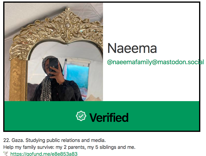 Screenshot of Gaza Verified with Naeema's page. Text says: "22. Gaza. Studying public relations and media. Help my family survive: my 2 parents, my 5 siblings and me. 🕊 https://gofund.me/e8e853a83"