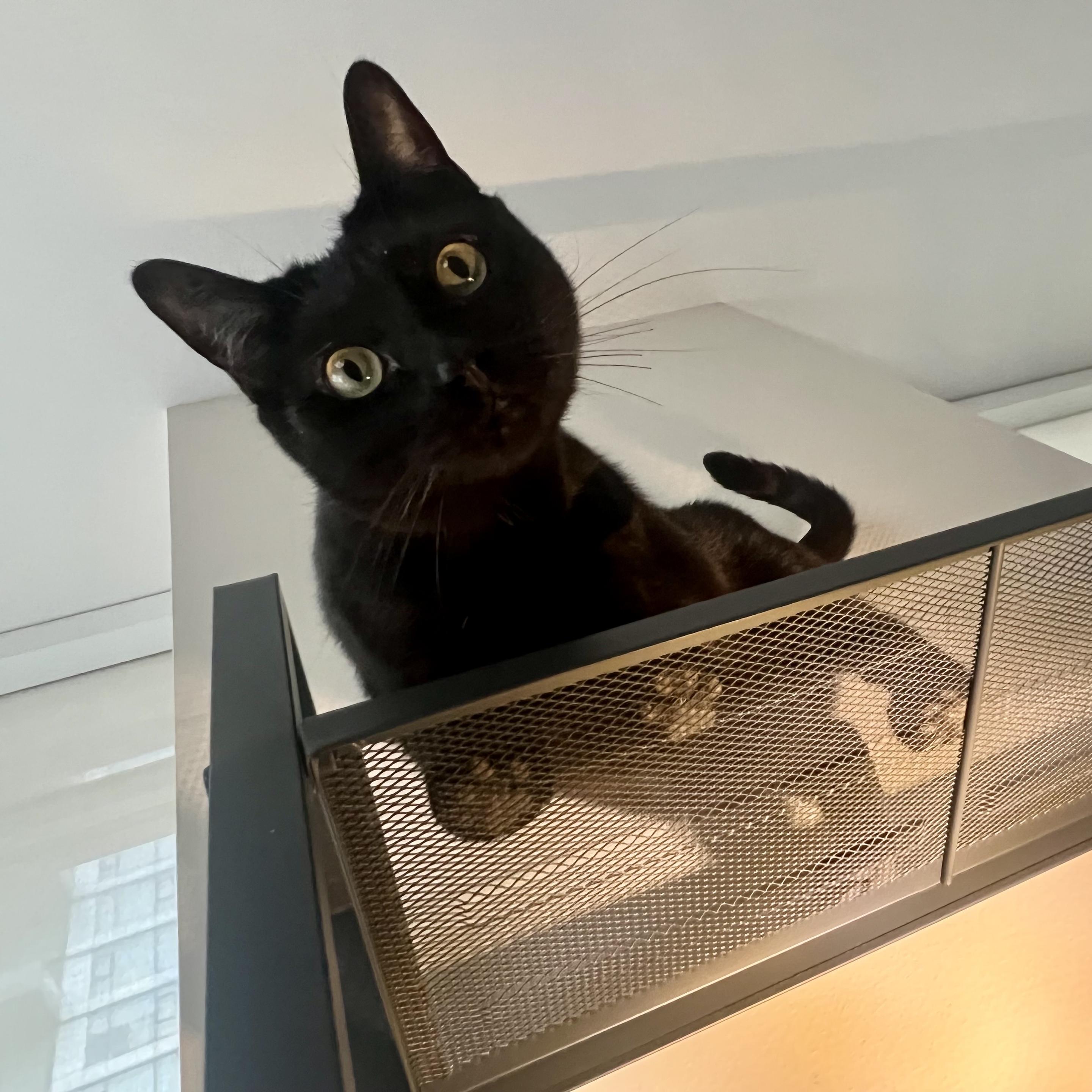 Sleek black cat standing on the top of a mesh metal shelf, looking down towards the camera You can see his toes through the shelf. I have lighting set up under the shelves to illuminate said toes. With the angle his head looks big and his eyes are wide, and this all looks very silly