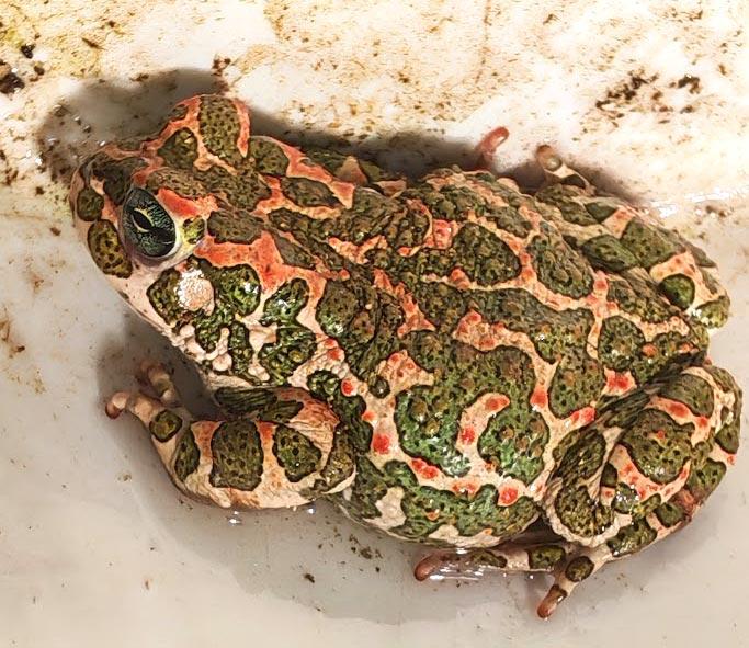 Rospo smeraldino in un secchio di plastica bianca un po' scocciato per essere stato disturbato così