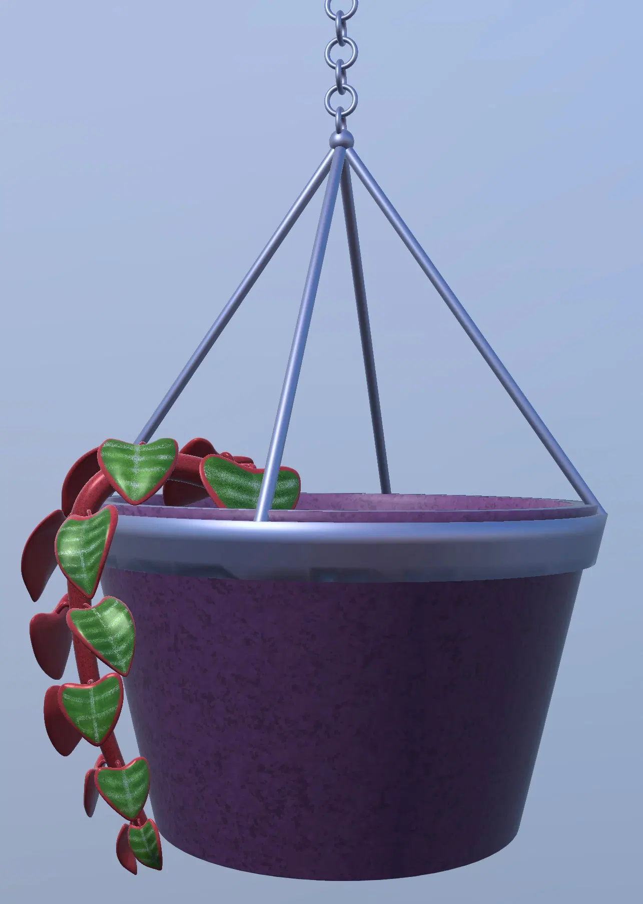 A ceropegia woodii plant hanging in a purple pot. The glossy green and red leaves of the plant hang down in one short vine, it has a long way to be fully grown. Created, painted, and rendered on iPad.
