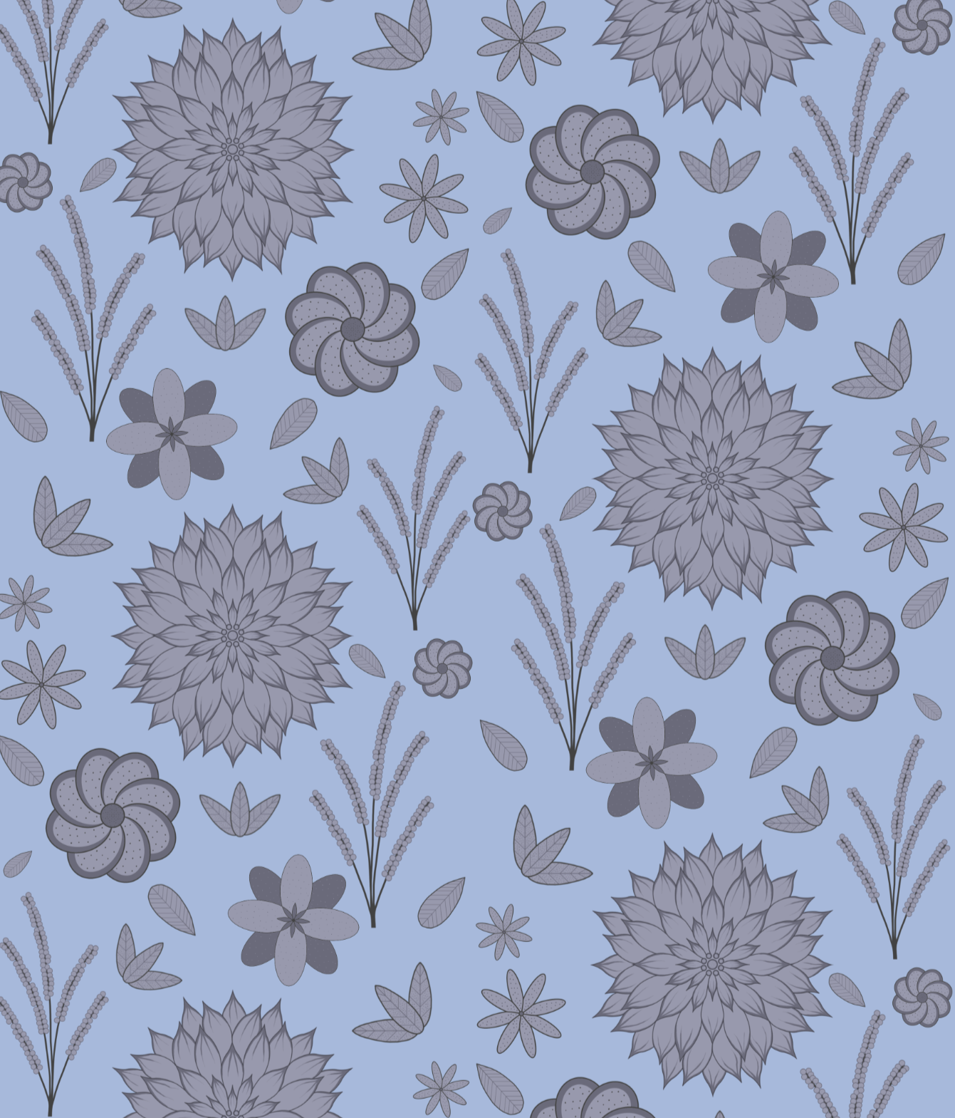 A pattern of 2D gray and black flowers against light blue. One of the first patterns I experimented with designing, but certainly not the last.