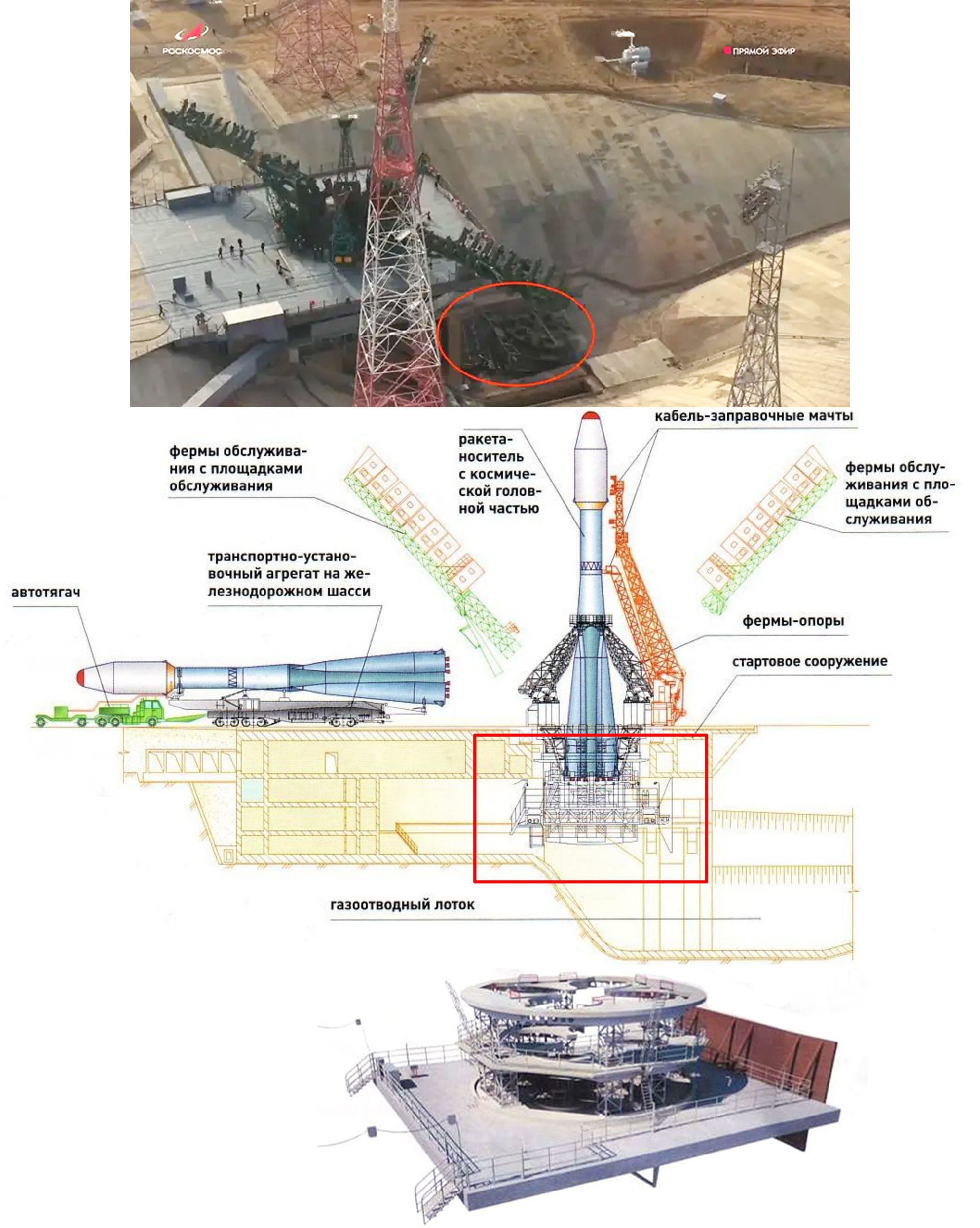 1. Pic of the launch pad after the mishap, showing the mobile service platform lying crumpled in the flame pit. 2. Diagram of the launch pad with a rocket and the deployed mobile service platform below it. 3. Illustration of the mobile service platform.
