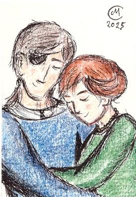 Tinten- und Buntstiftskizze: Gezeigt sind vom Kopf bis zum Oberkörper ein Mann (links) und eine Frau (rechts), die einander leicht seitlich umarmen. Die Frau ist etwa einen halben Kopf kleiner als der Mann. Der Mann trägt eine blaue Tunika über einem hellen Hemd, hat rechts (von ihm, nicht vom Betrachter aus gesehen) eine Augenklappe und lange braune Haare, die er im Nacken zusammengebunden trägt. Die Frau trägt eine grüne Tunika und eine kurze Kette aus gelben Bernsteinperlen. Sie hat ihre kastanienbraunen Haare hinter dem Kopf hochgesteckt. Beide haben die Augen geschlossen und lächeln leicht, als würden sie sich miteinander durchaus wohlfühlen.