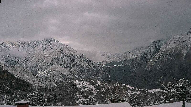 A wide view of several mountains, from left: - Taboche (6,500 meters/21,325 feet) - Mount Everest (8,848 meters/29,032 feet) - Lhotse (8,516 meters/27,939 feet) - Ama Dablam (6,814 meters/22,355 feet)