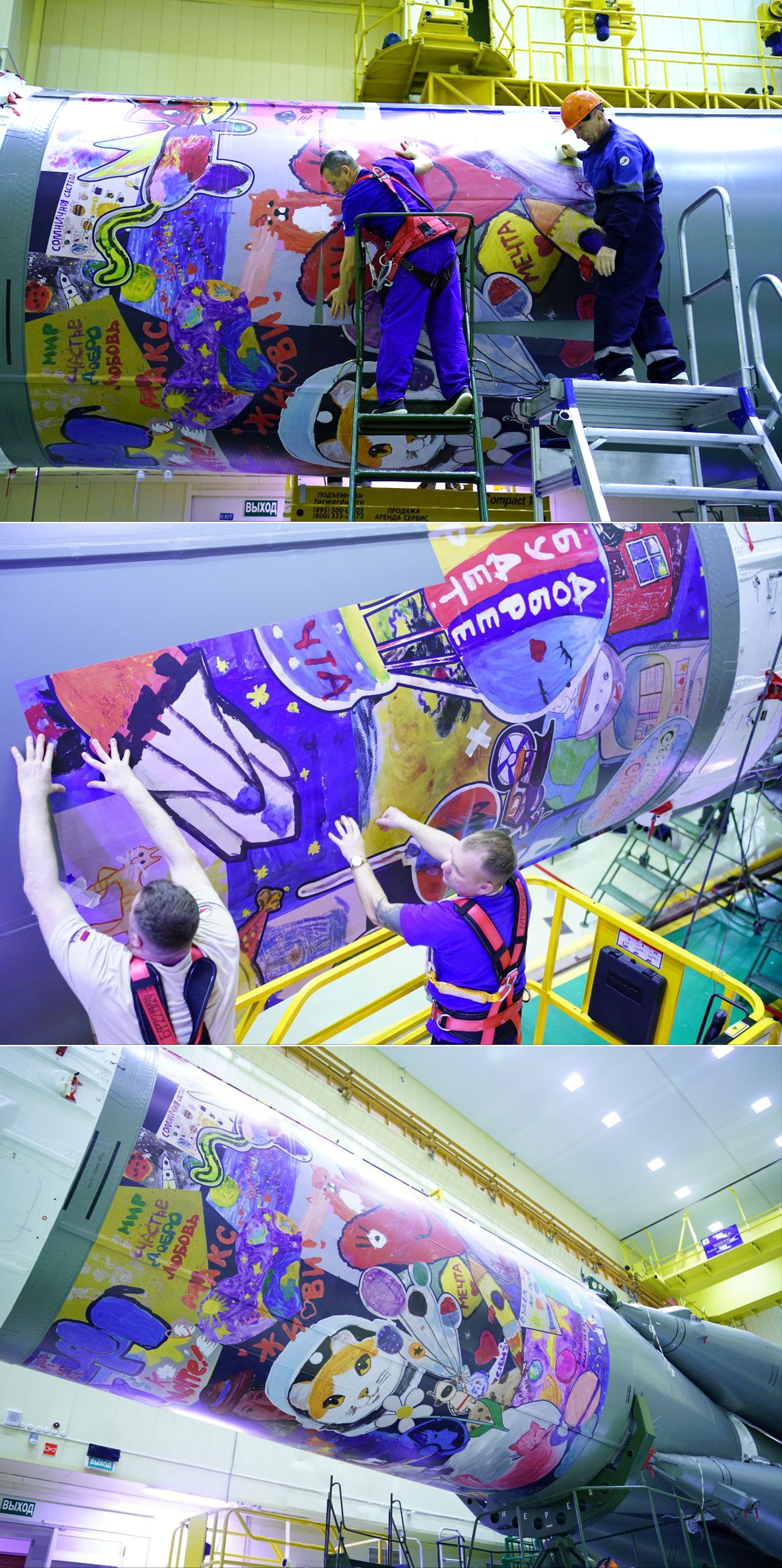 3 pics pics of the artwork by young cancer patients being installed on the Soyuz rocket in the assembly building at Baikonur.