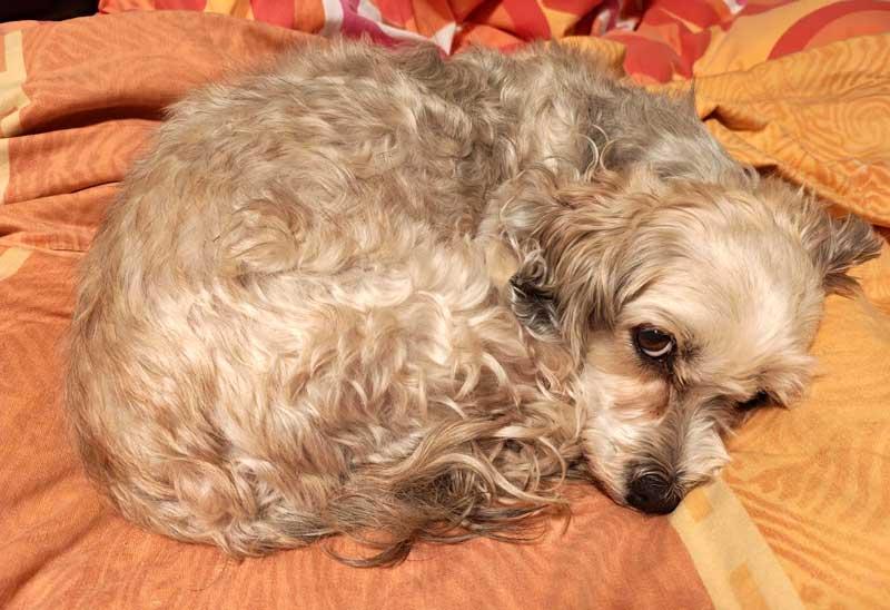 Cagnolina beige acciambellata su lenzuola arancioni che guarda l'obiettivo