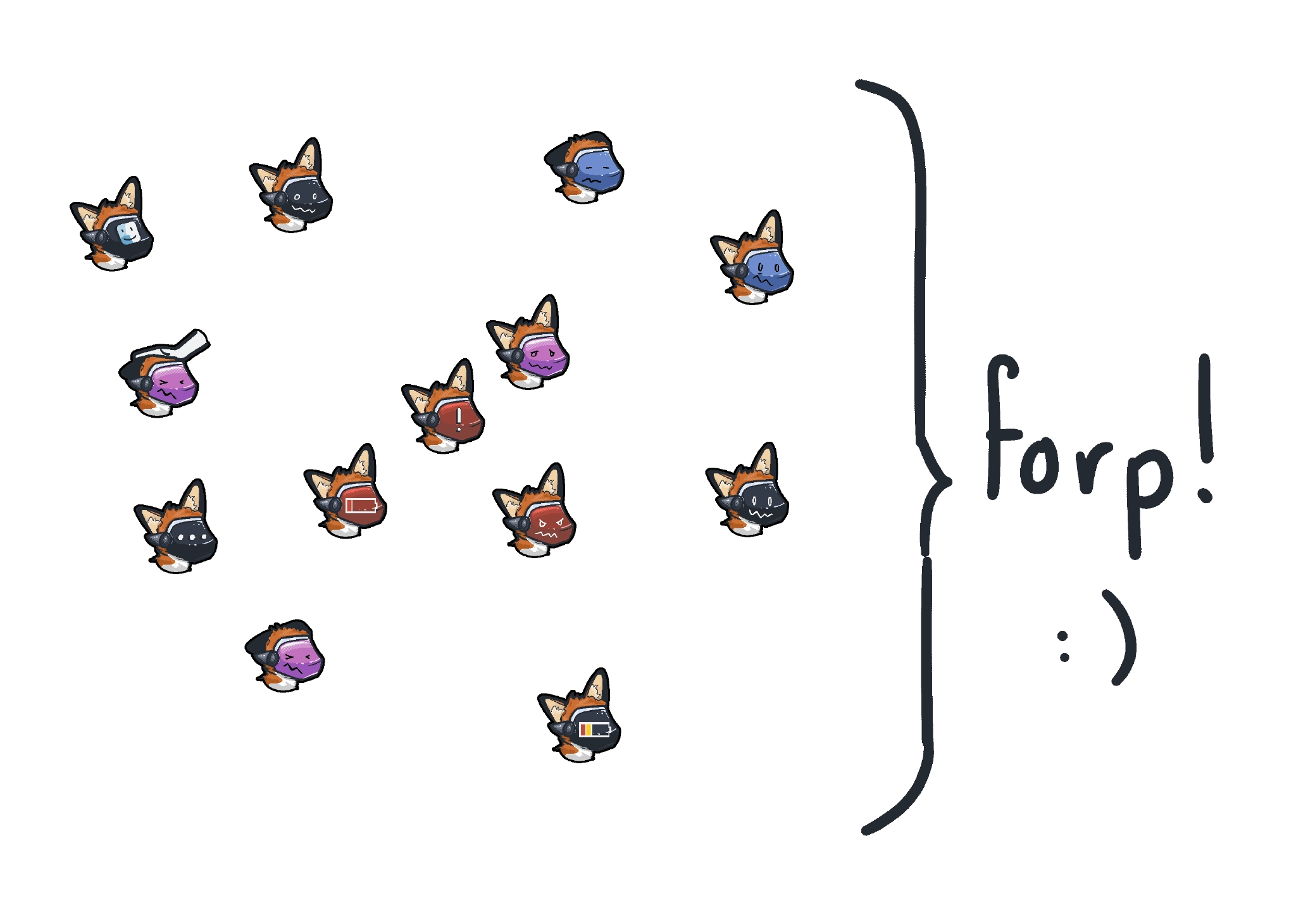 A picture of a bunch of protogen foxes haphazardly placed onto a screen. To the right is a left-facing curly bracket. Next to it is the text "forp! :)"