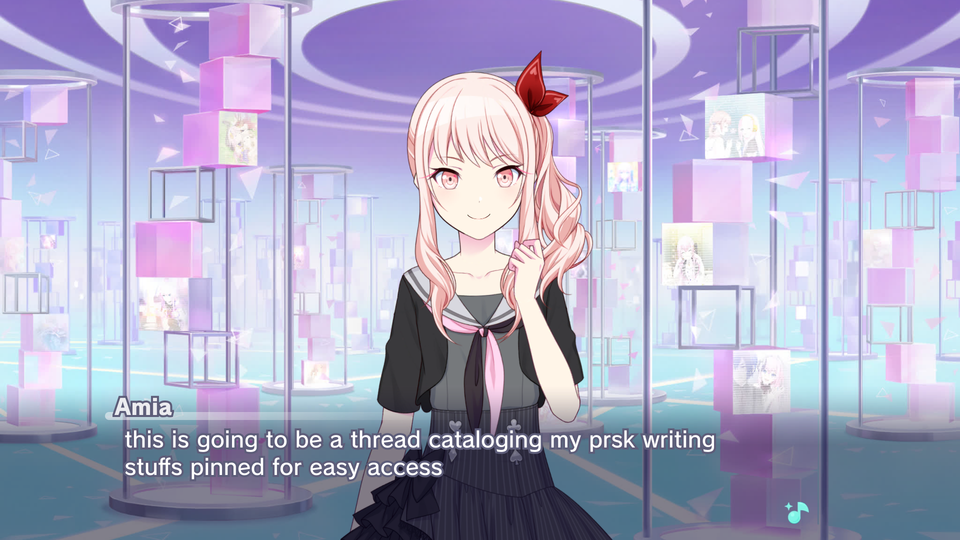 project sekai custom story board with mizuki in some abstract space with spiral cube columns that have prsk memories on them saying "this is going to be a thread cataloging my prsk writing stuffs pinned for easy access"