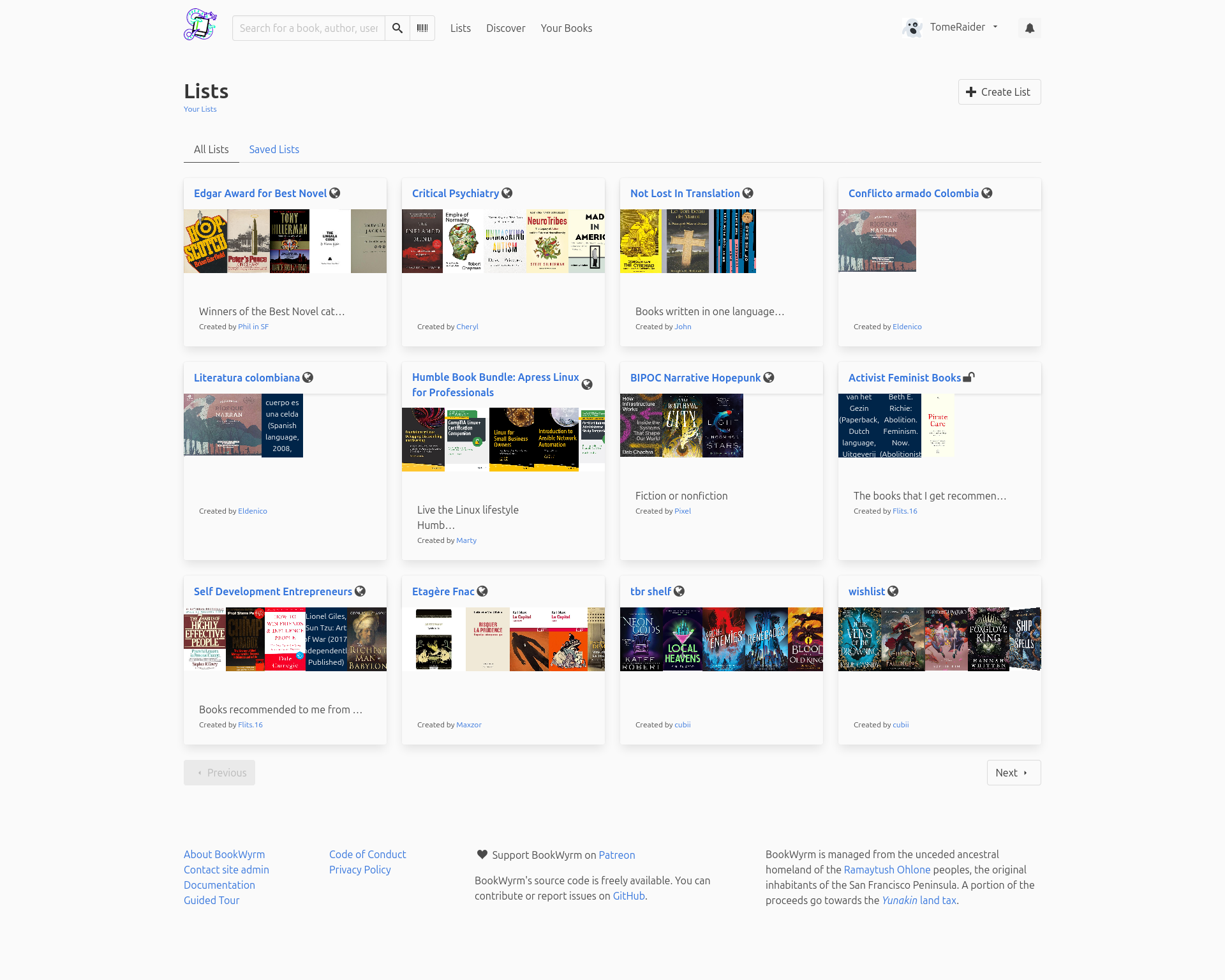 Screenshot of BookWyrm's Lists page showing lists of books created by other users which the user can explore to discover more books to read.