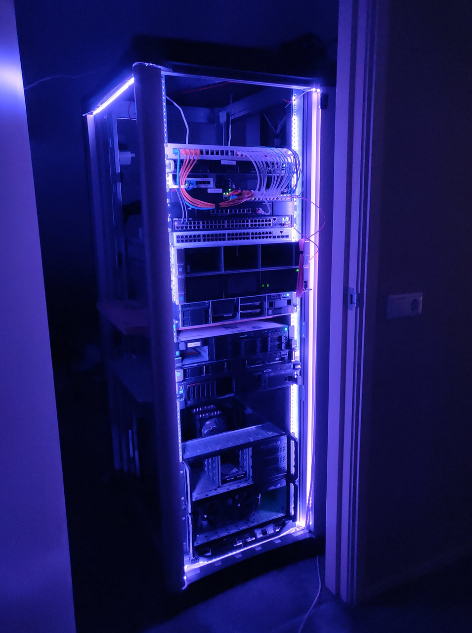 photograph of a server rack illuminated with purple led lights. it is about 40u, almost entirely filled with hardware. it looks very clean and not jank anymore