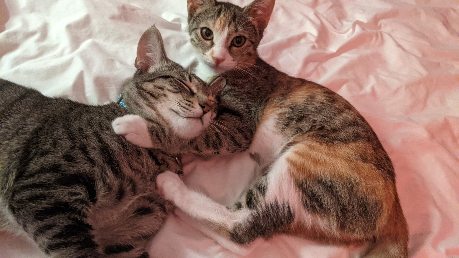 Two kittens cuddled on a bed. The smaller orange and brown one is looking up at the camera, in the middle of licking the larger striped kitten's head, which she is holding. The bigger kitten has his eyes closed and is practically smiling.