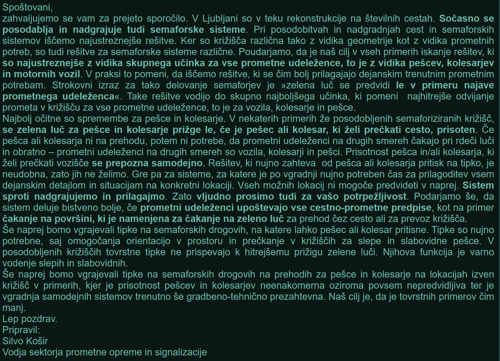 V praksi to pomeni, da iščemo rešitve, ki se čim bolj prilagajajo dejanskim trenutnim prometnim potrebam. Strokovni izraz za tako delovanje semaforjev je »zelena luč se predvidi le v primeru najave prometnega udeleženca«. Take rešitve vodijo do skupno najboljšega učinka, ki pomeni najhitrejše odvijanje prometa v križišču za vse prometne udeležence, to je za vozila, kolesarje in pešce. Najbolj očitne so spremembe za pešce in kolesarje. V nekaterih primerih že posodobljenih semaforiziranih križišč, se zelena luč za pešce in kolesarje prižge le, če je pešec ali kolesar, ki želi prečkati cesto, prisoten. Če pešca ali kolesarja ni na prehodu, potem ni potrebe, da prometni udeleženci na drugih smereh čakajo pri rdeči luči in obratno – prometni udeleženci na drugih smereh so vozila, kolesarji in pešci. Prisotnost pešca in/ali kolesarja, ki želi prečkati vozišče se prepozna samodejno. Rešitev, ki nujno zahteva od pešca ali kolesarja pritisk na tipko, je neudobna, zato jih ne želimo.Gre pa za sisteme, za katere je po vgradnji nujno potreben čas za prilagoditev vsem dejanskim detajlom in situacijam na konkretni lokaciji.Vseh možnih lokacij ni mogoče predvideti v naprej.Sistem sproti nadgrajujemo in prilagajmo. Zato vljudno prosimo tudi za vašo potrpežljivost. Podarjamo še, da sistem deluje bistveno bolje, če prometni udeleženci upoštevajo vse cestno-prometne predpise, kot na primer čakanje na površini, ki je namenjena za čakanje na zeleno luč za prehod čez cesto ali za prevoz križišča.