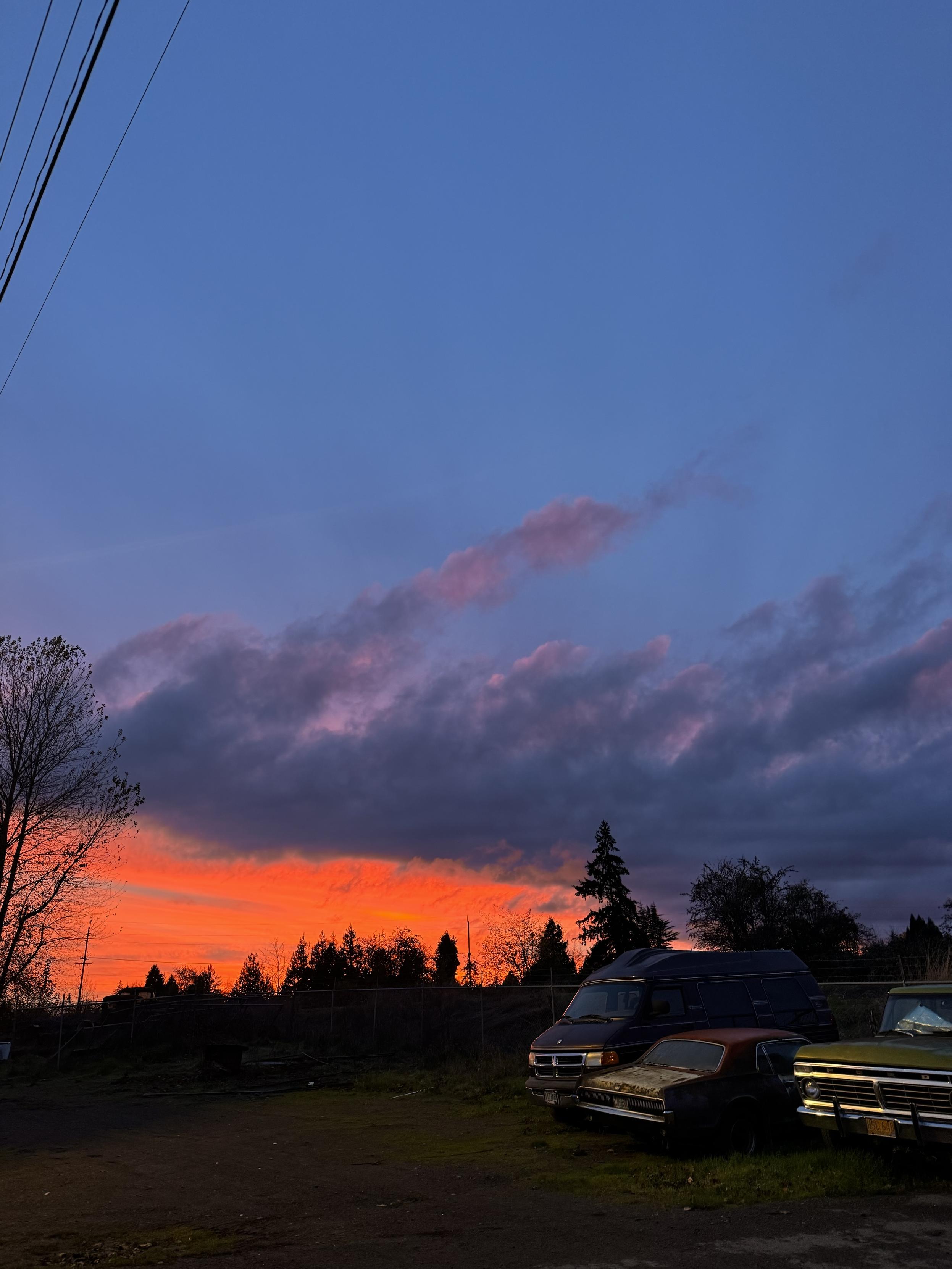 A vibrant sunset displays orange and pink hues against a blue sky, with dark clouds scattered above. Silhouetted trees and power lines are visible in the background, while several parked vehicles, including an old van and cars, are situated in the foreground.