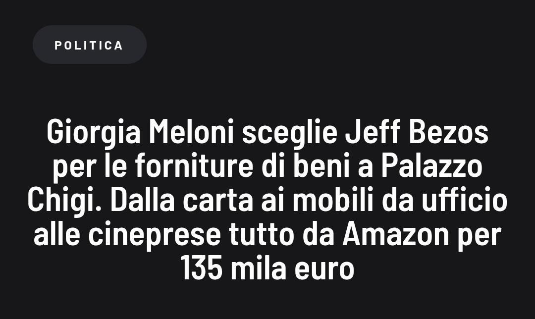 Giorgia Meloni sceglie Jeff Bezos per le forniture di beni a Palazzo Chigi. Dalla carta ai mobili da ufficio alle cineprese tutto da Amazon per 135 mila euro