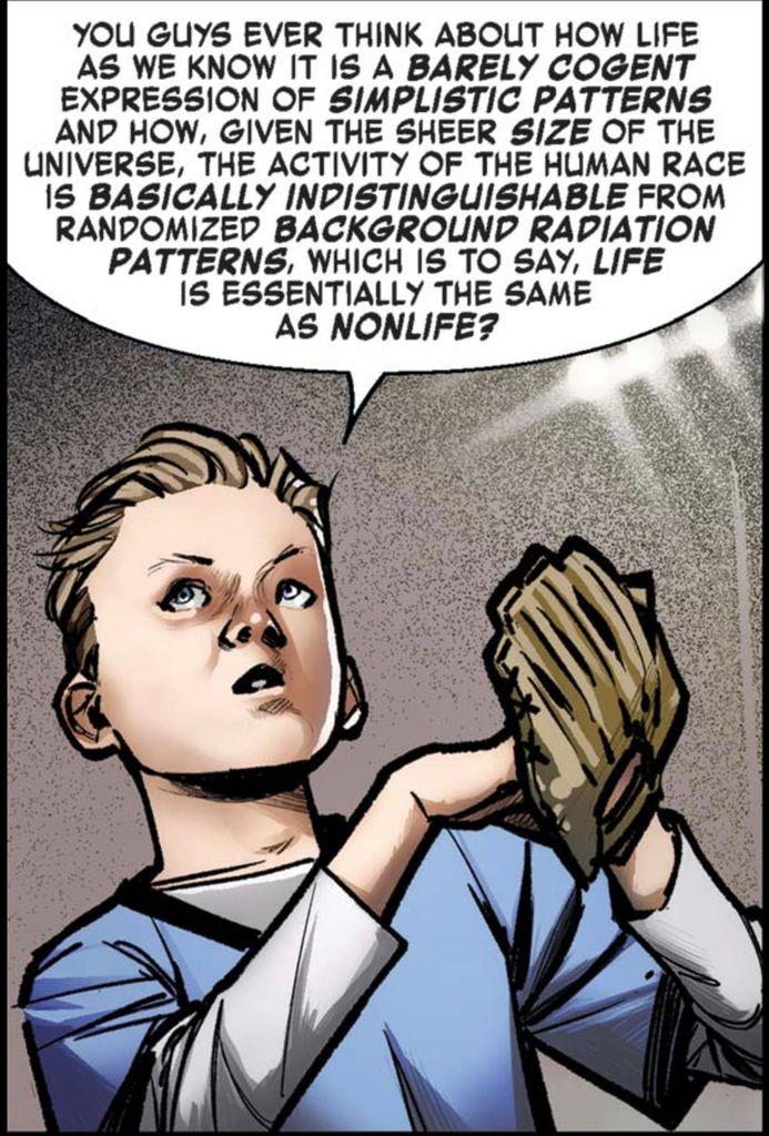 A teenage boy looks up at somebody while one hand rests inside the baseball mitt on his other hand and says, “You guys ever think about how life as we know it is a BARELY COGENT expression of SIMPLISTIC PATTERNS, and how, given the sheer SIZE of the universe, the activity of the human race is BASICALLY INDISTINGUISHABLE from randomized BACKGROUND RADIATION PATTERNS, which is to say, LIFE is essentially the same as NON-LIFE?“