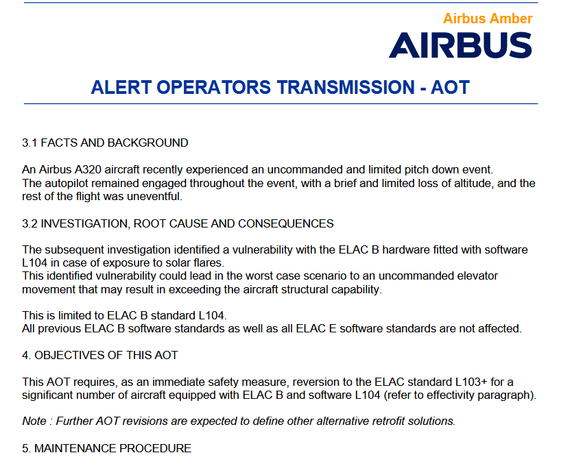 Section of the AOT - Airbus Amber ALERT OPERATORS TRANSMISSION - AOT AOT ref: A27N022-25 Rev 00 Page 3 of 8 Date: 28-NOV-2025 C80_AOT_FM1104649_v10.0 © AIRBUS S.A.S. 2025. ALL RIGHTS RESERVED. CONFIDENTIAL AND PROPRIETARY DOCUMENT 3.1 FACTS AND BACKGROUND An Airbus A320 aircraft recently experienced an uncommanded and limited pitch down event. The autopilot remained engaged throughout the event, with a brief and limited loss of altitude, and the rest of the flight was uneventful. 3.2 INVESTIGATION, ROOT CAUSE AND CONSEQUENCES The subsequent investigation identified a vulnerability with the ELAC B hardware fitted with software L104 in case of exposure to solar flares. This identified vulnerability could lead in the worst case scenario to an uncommanded elevator movement that may result in exceeding the aircraft structural capability. This is limited to ELAC B standard L104. All previous ELAC B software standards as well as all ELAC E software standards are not affected. 4. OBJECTIVES OF THIS AOT This AOT requires, as an immediate safety measure, reversion to the ELAC standard L103+ for a significant number of aircraft equipped with ELAC B and software L104 (refer to effectivity paragraph)