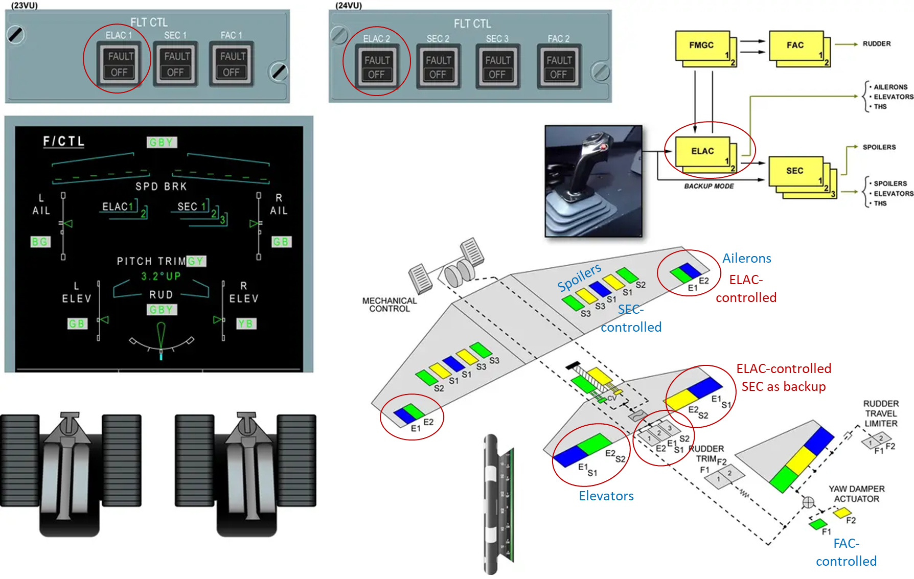Diagram of computers, the surfaces they control and some control/display units on the flight deck. Electrical Flight Control System (EFCS) computers – 2 Elevator Aileron Computers (ELAC) for pitch and roll control, Normal elevator and stabilizer control. Aileron control. 3 Spoiler Elevator Computers (SEC) for pitch and roll control, Spoilers control. Standby elevator and stabilizer control. 2 Flight Augmentation Computers (FAC) for yaw control, Electrical rudder control. 2 Flight Control Data Concentrators (FCDC) for indication and maintenance tests, Flight Control Data Concentrators (FCDC) acquire data from the ELACs and SECs and send it to the electronic instrument system (EIS) and the centralized fault display system (CFDS). 2 Flight Management Guidance Computer (FMGC) for autopilot commands, 2 Slat Flap Control Computers (SFCC) for slat and flap control.