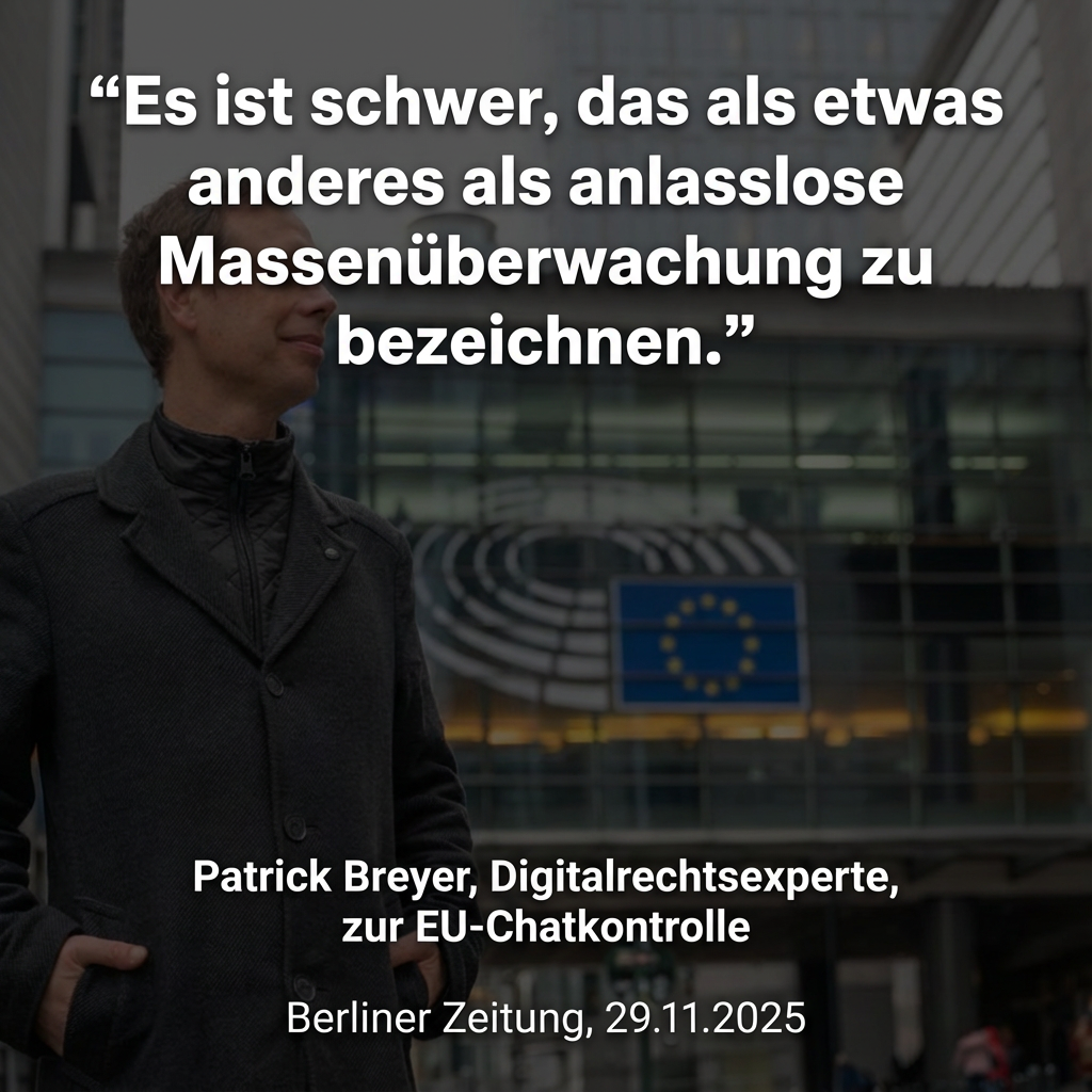 Das Bild ist eine Zitatkachel (Sharepic) für soziale Medien mit dunklem, leicht abgedunkeltem Hintergrund. Visueller Inhalt: Im Vordergrund auf der linken Seite steht Patrick Breyer. Er trägt einen dunklen Wintermantel, hat die Hände in den Taschen und blickt mit einem leichten Lächeln nach rechts an der Kamera vorbei. Text: Über dem Bild steht in großer, weißer Schrift das Zitat: „Es ist schwer, das als etwas anderes als anlasslose Massenüberwachung zu bezeichnen.“ Unterschrift: Im unteren Bereich steht zentriert in kleinerer weißer Schrift: Patrick Breyer, Digitalrechtsexperte, zur EU-Chatkontrolle Berliner Zeitung, 29.11.2025