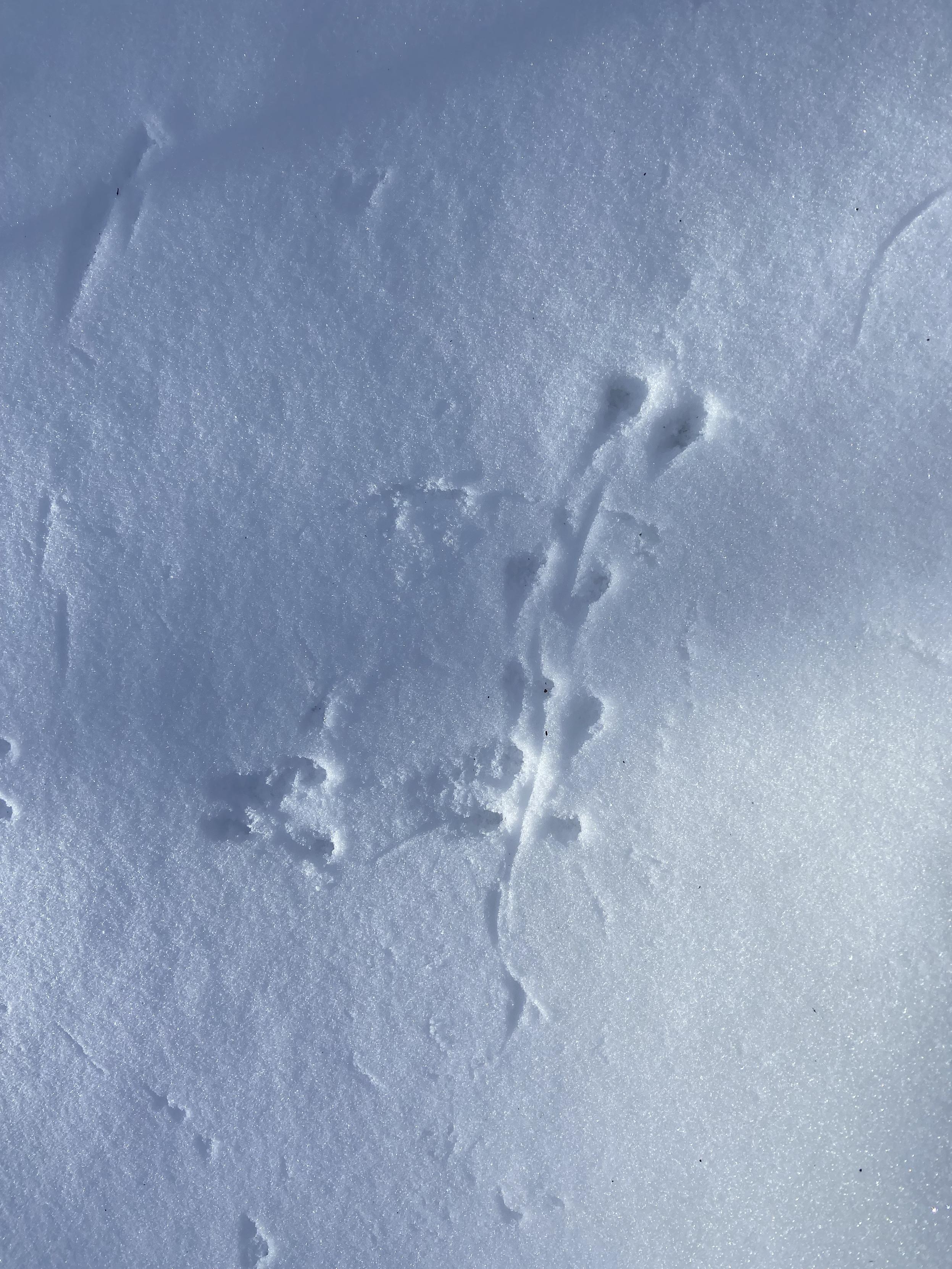 Snow with tracks of a small animal with a tail. Pairs of deeper impressions, with curved thin lines from the tail.