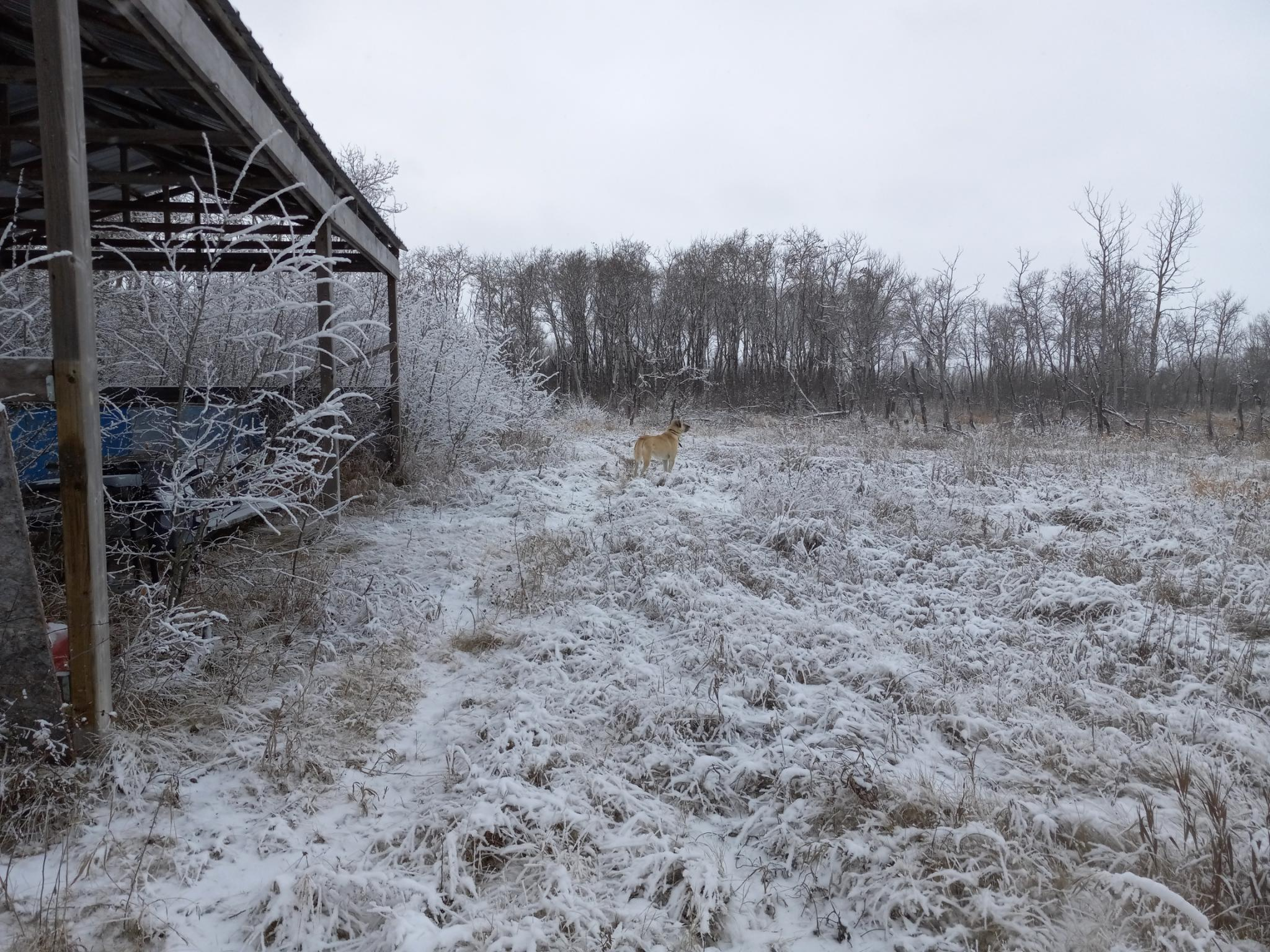 A yellowish dog is nearly the only spot of colour in a frosty snowy grass field, with an open-sided shed and a bunch of frosty trees in the background. The sky above is grey.