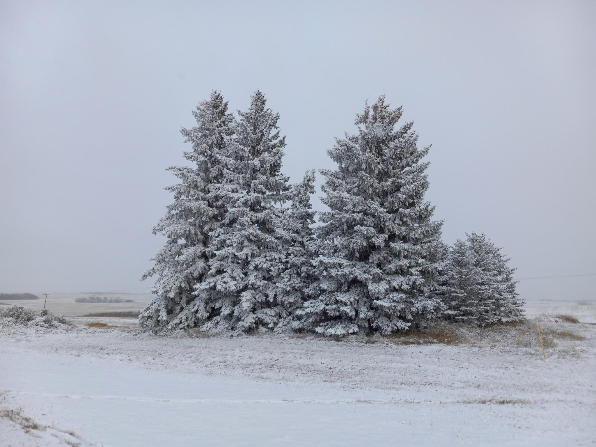 A clump of perfectly frosted spruce trees, in a snow-covered field, with grey sky above.