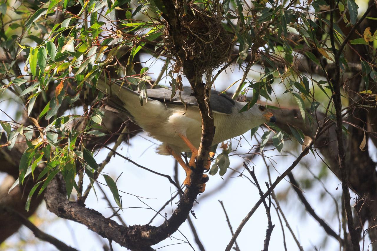 A large hawk in light and medium grey with a yellow beak, legs and claws. Having just landed on a branch and thus still horizontal. There's a small (possibly unused) nest further along the branch.