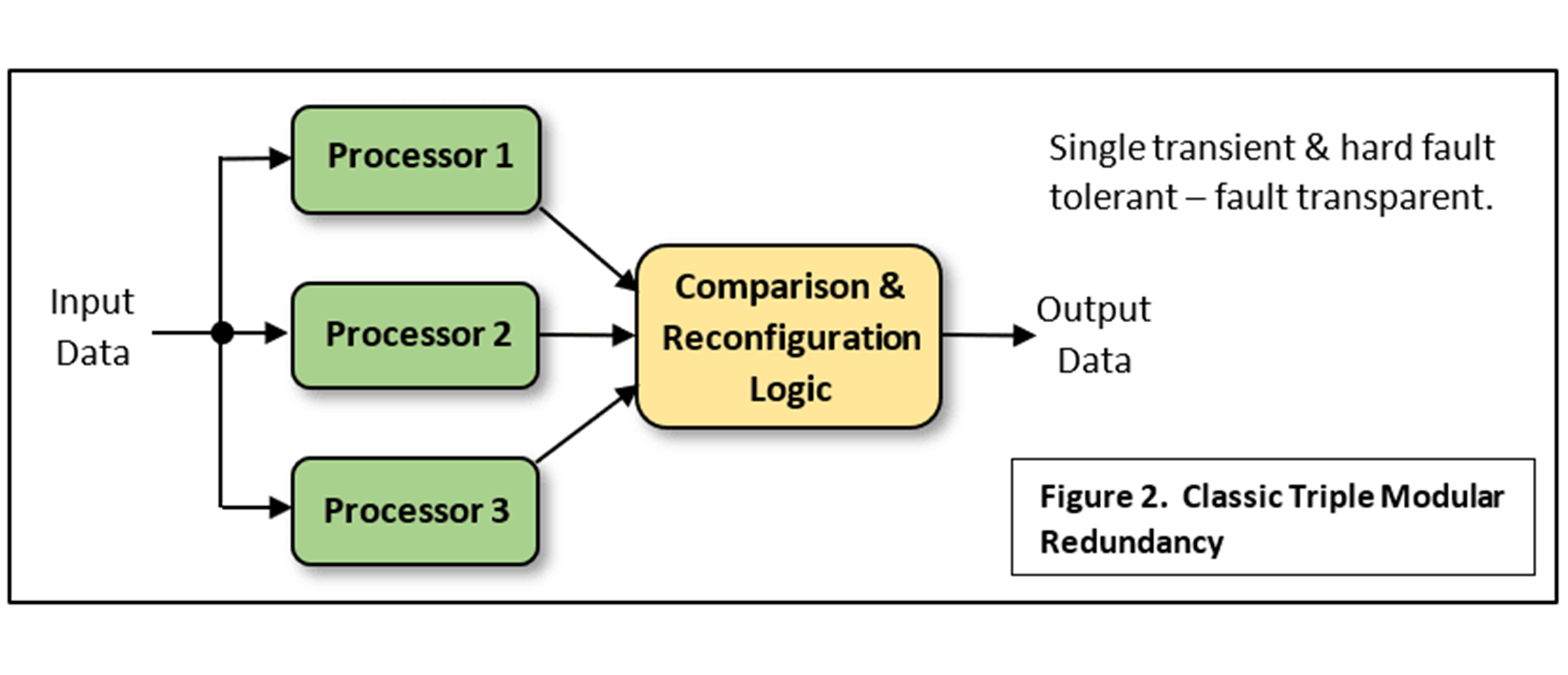 Illustration of Triple Modular redundancy - 3 identical logic elements compute outputs from inputs. The output are compared in a separate element which outputs the value that match in 2 or 3 on its inputs and flags the erroneous logic element if any. Source: https://www.rs-online.com/designspark/when-redundancy-is-a-good-thing