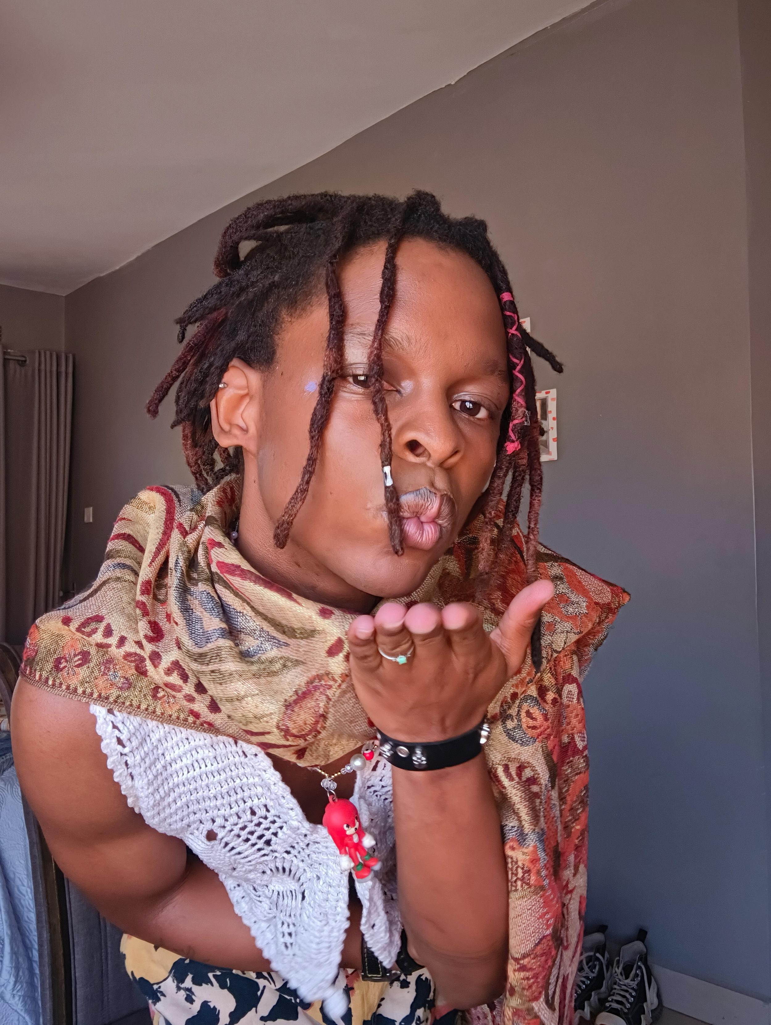 A cute black person with makeup done. Now Blowing a kiss towards the screen. She also has a Knuckles the Echidna necklace on. The makeup includes a blended concealer, some eyeliner and some sparkly gold about the eyes. With blue dots at the outer corners of each eye.