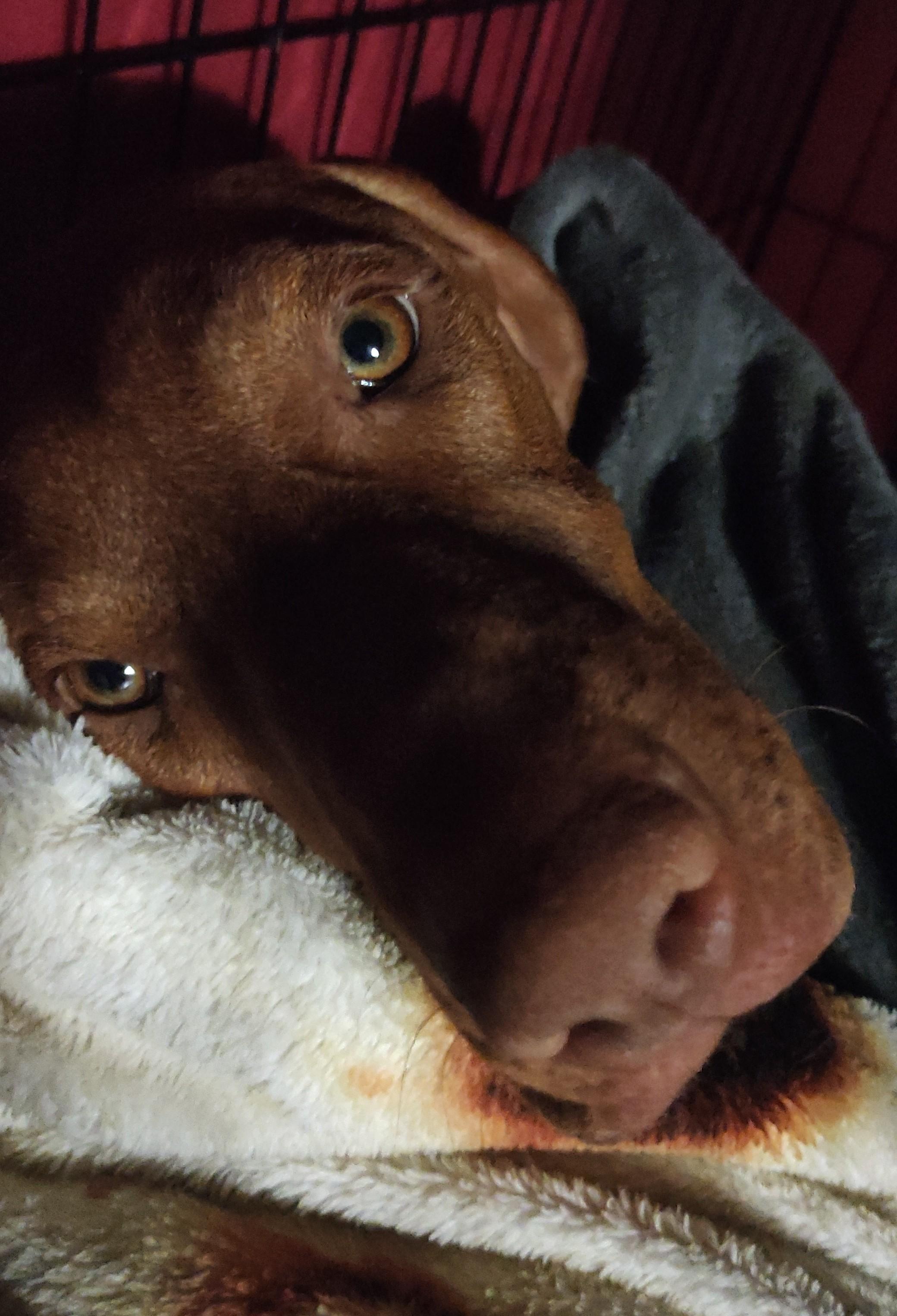 il muso di Ecco che sbuca da una serie di coperte di pile, รจ un faccione arancione peloso con occhi incredibili