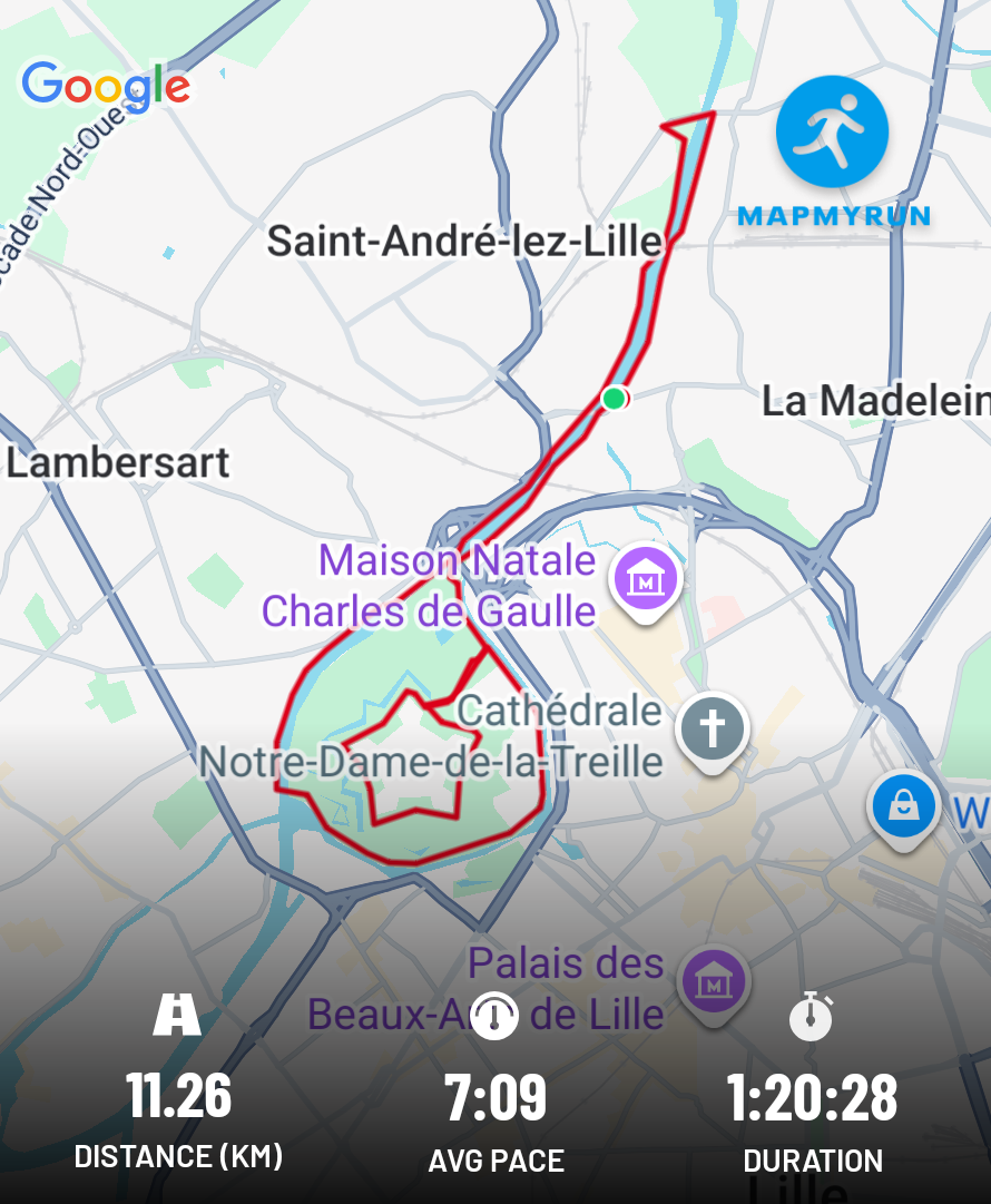 Running map & stats Distance 11.26 km Avg pace 7:09 Duration 1:20:28
