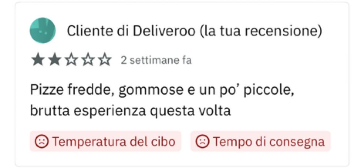 Recensione su deliveroo di 2 stelle con la motivazione: “pizze fredde, gommose e un po’ piccole, brutta esperienza questa volta”. Seguono faccine tristi accanto a “temperatura cibo” e “tempo di consegna”