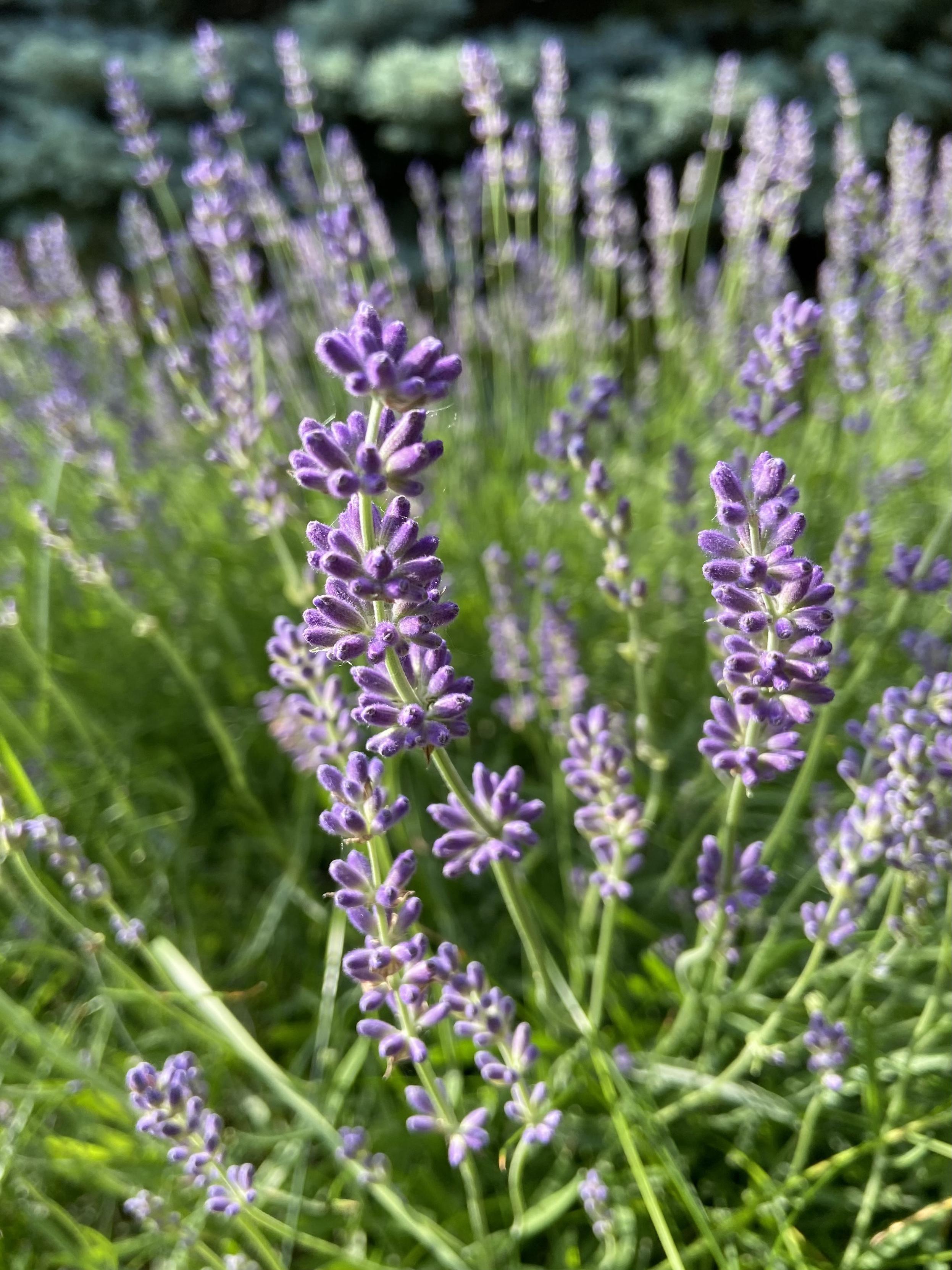 Sprigs of lavender with their still closed purple buds, against the background of their own greenery, in solstice late afternoon sunlight