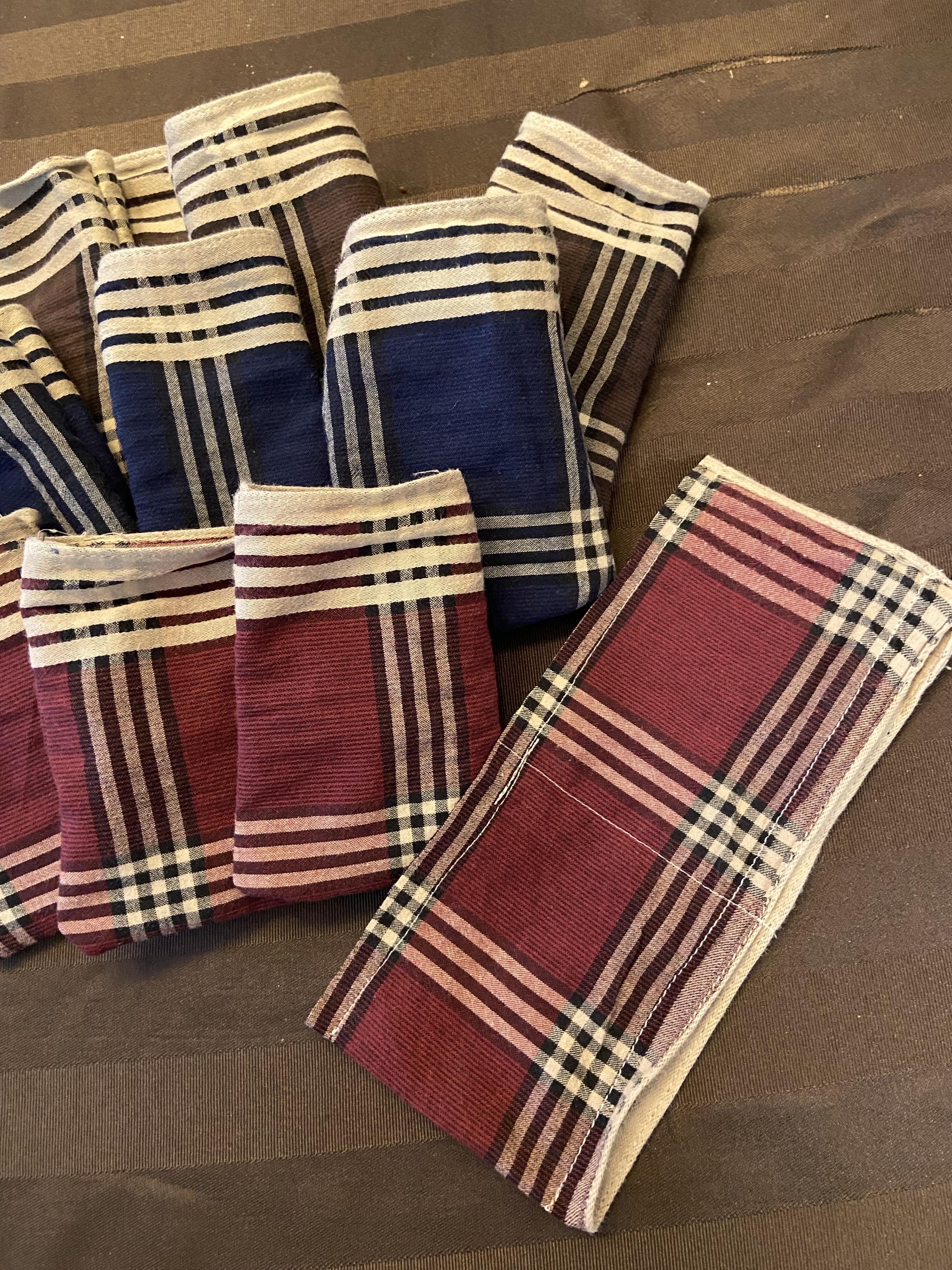 One sewn fabric bag that is still inside out, with a lot of excess fabric at the bottom, next to several bags that have been turned right side out.